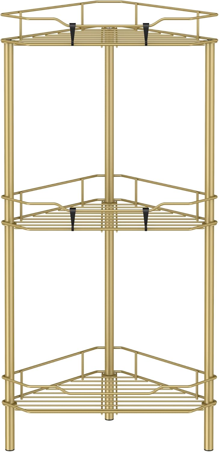 3 Tier Floor Standing Corner Shower Caddy Organizer Shelf with Hooks, Bathroom Shelves Stand Rack, Gold