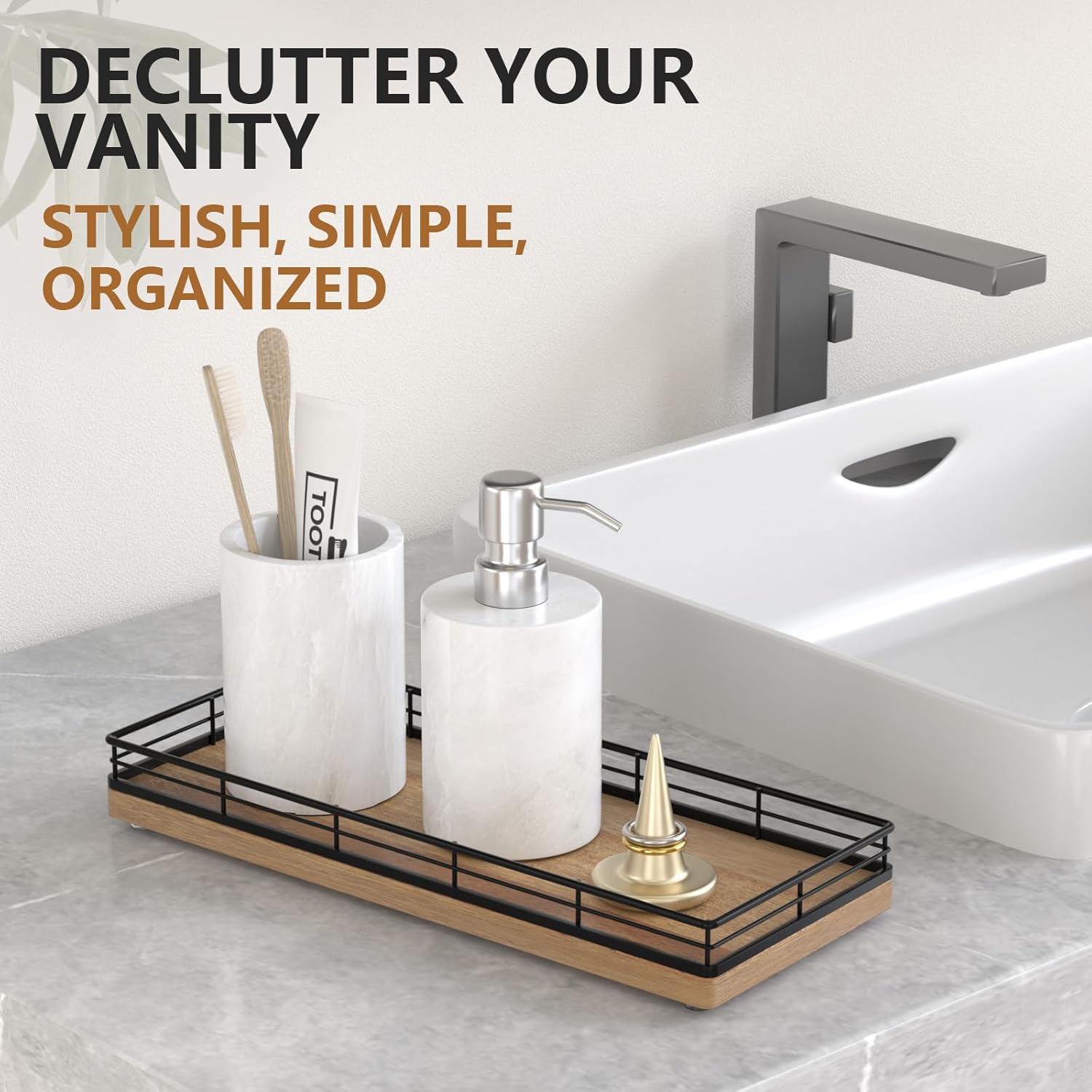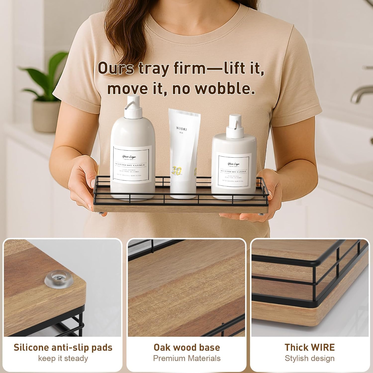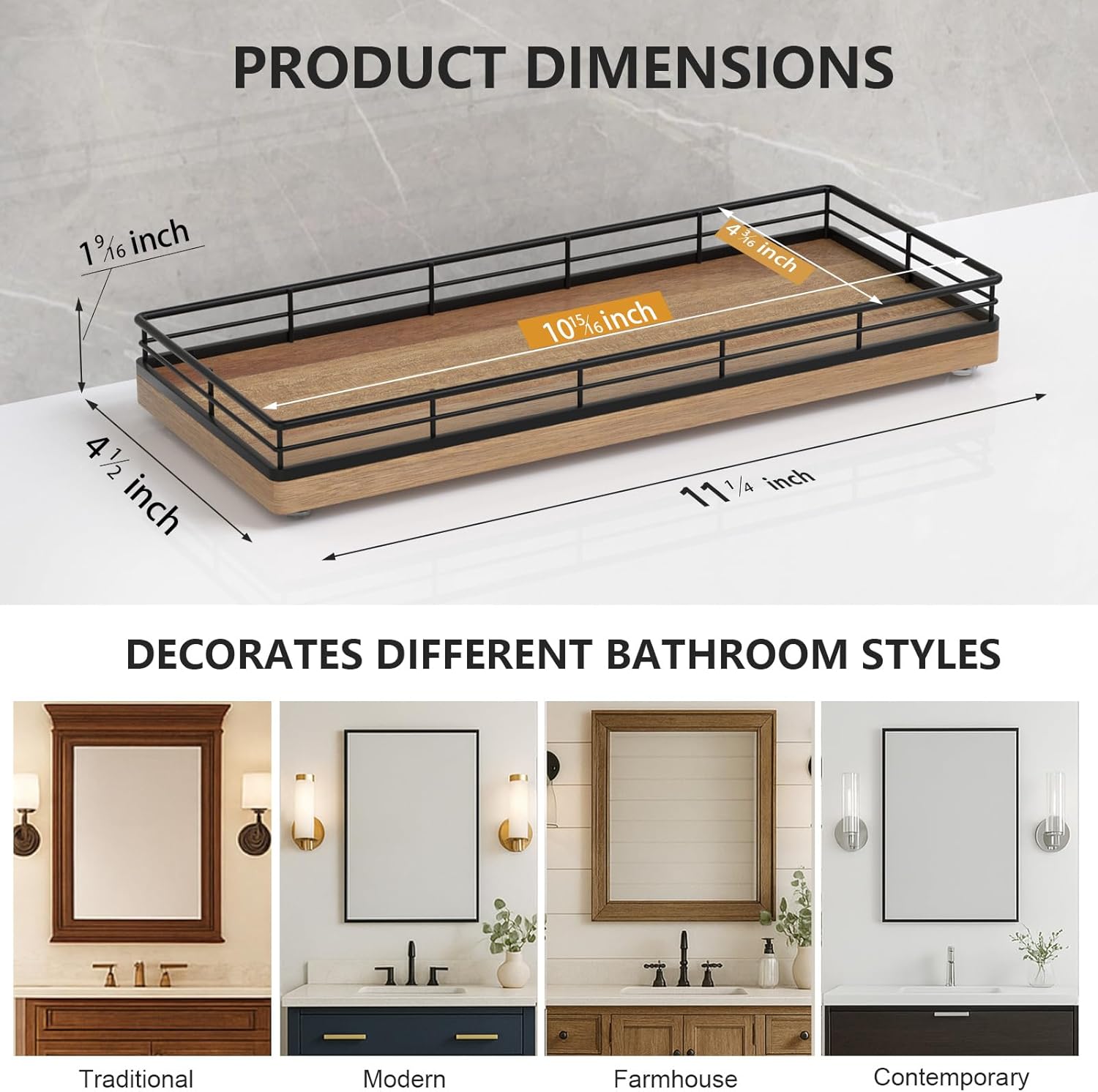 Bathroom Tray for Counter Top Organizer – Acacia Wood Vanity Tray with Metal Frame for Dresser, Kitchen, Nightstand – Black & Acacia Decorative Storage