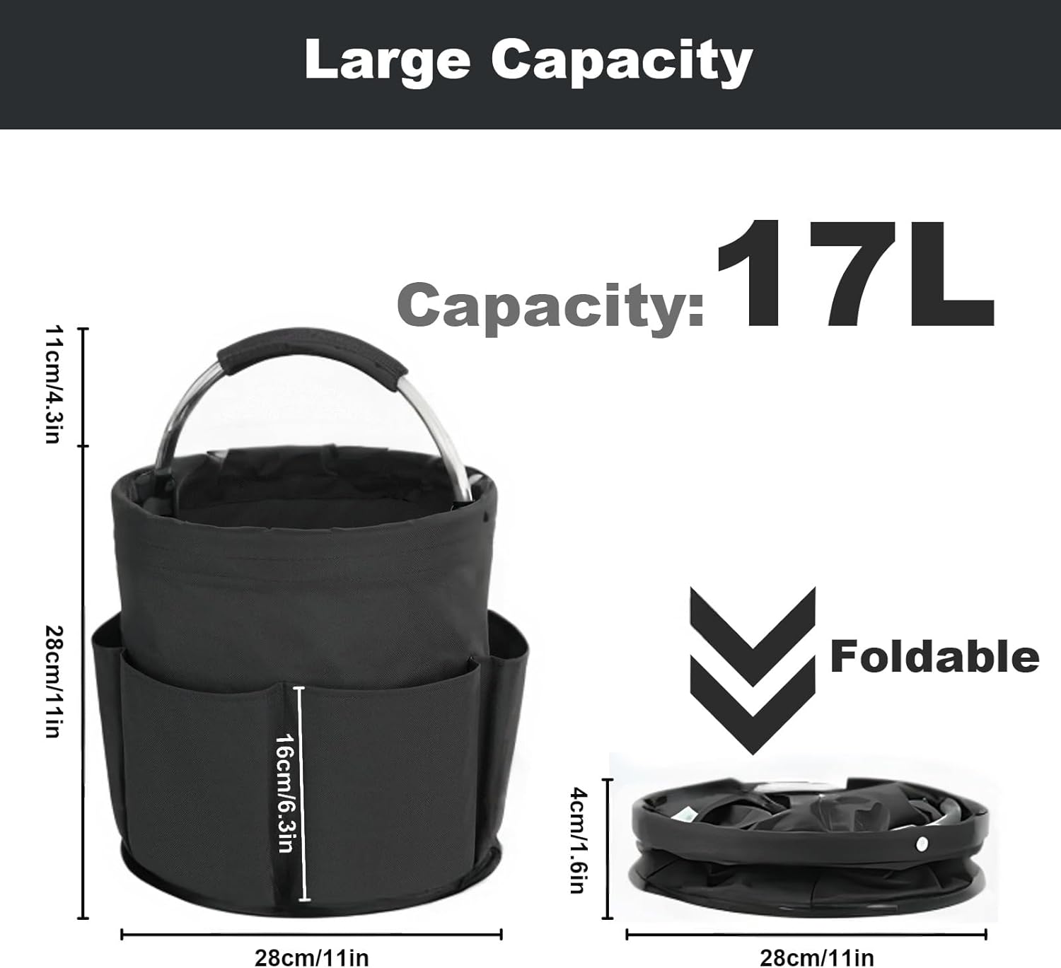 - Large Capacity: Cleaning products organiser size 28 x 28cm/11 x 11inches. Our 17L cleaning bucket has 6 outer pockets, with 1 large pocket to store the cleaning cloths, bottles, liquids, or sprays. It makes cleaning easier for you and keeps your utensils well organised
