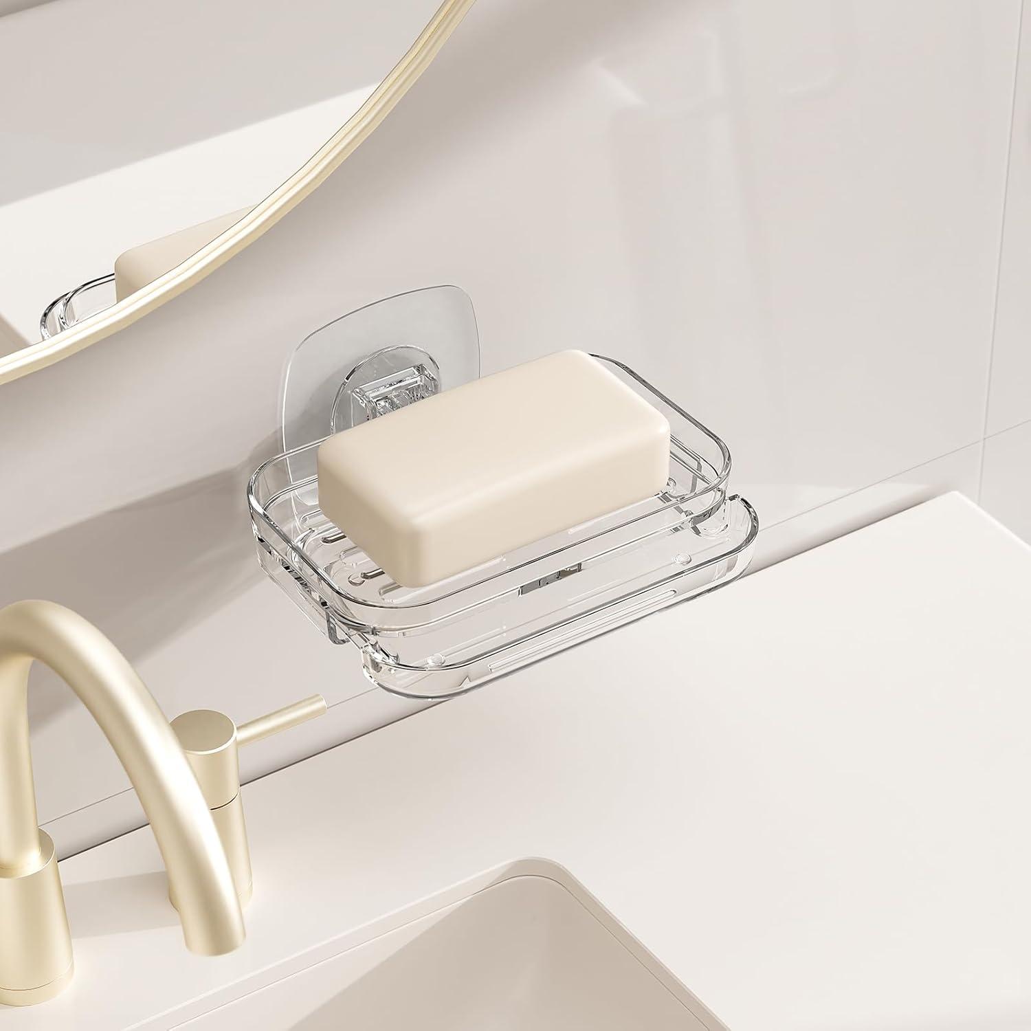 Bar Soap Dish for Shower Clear Acrylic Soap Holder with Self-Draining Design - No Drilling Required Strong Adhesive Mount for RV Bathroom and Kitchen Easy to Clean and Space-Saving (Adhesive)