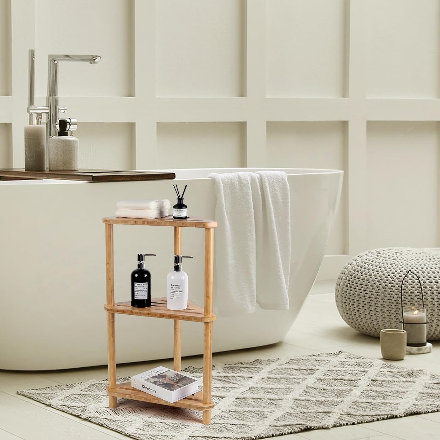 Bamboo Corner Shower Caddy Stand 3-Tier Waterproof,Free Standing Corner Shelf Shower Stool Organizer for Inside Shower,Space-Saving Storage Shelf with Anti-Slip Feet