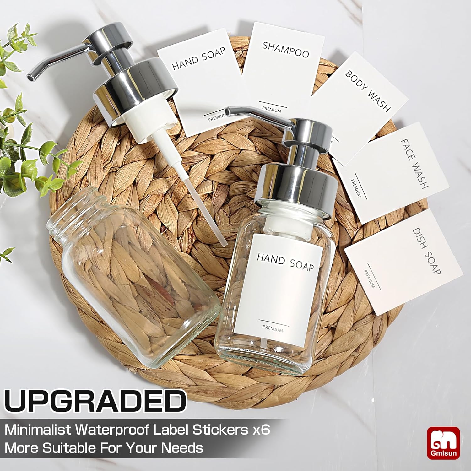 GMISUN Foaming Soap Dispenser, 2 Pcs 8.5 Fl oz Clear Glass Soap Dispenser, Modern Hand Soap Dispensers for Bathroom & Kitchen, Refillable Foam Soap Dispensers with Silver Pumps & Waterproof Labels