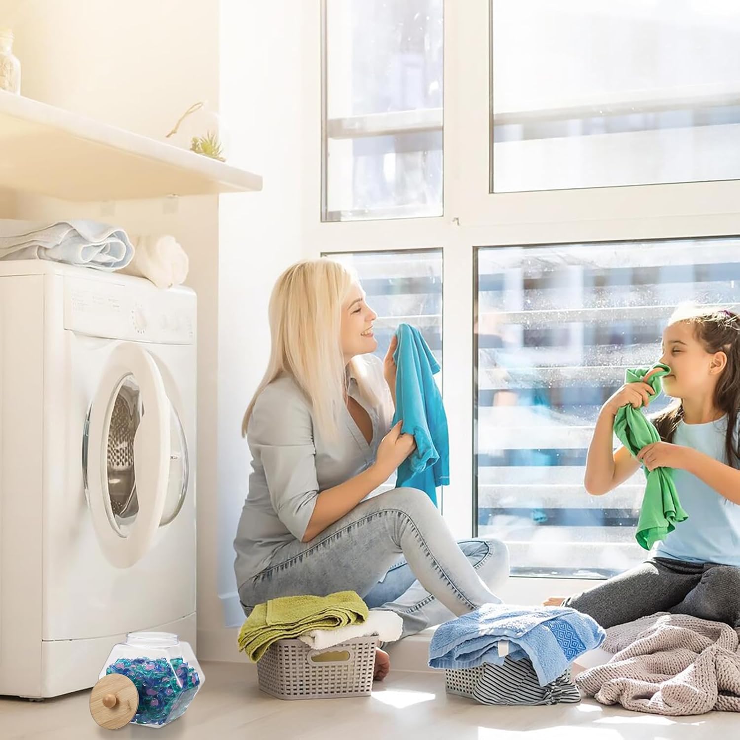 - 【Versatile and Functional】: The laundry container is great for organizing a variety of household items like laundry powder, scent boosters, dishwasher salt, cotton swabs, and cotton balls. Additionally, it also serves as an excellent food storage jar for coffee capsules, candies, cookies, and oatmeal loops. Moreover, the clothespins, hair tools, building blocks, puzzles, craft supplies can be neatly organized in it as well.