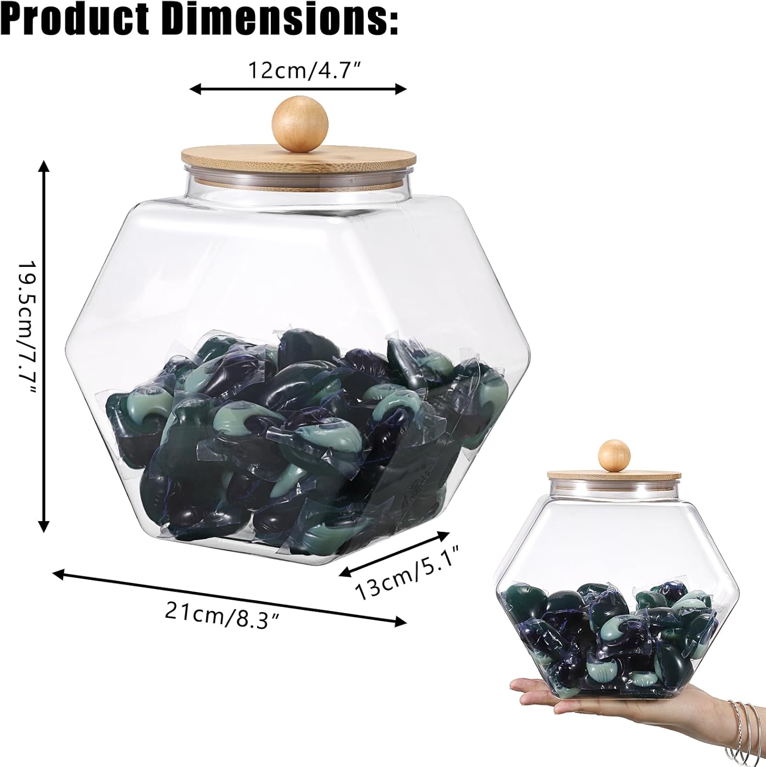 - 【Airtight Seal Ring】The airtight seal ring keeps your detergent and pods fresh and protected from moisture damage. Thanks to this sealing function and the size of 8.3"x5.1"x7.7", the laundry storage jar offers ample room for all your storage needs, not only making it perfect for organizing your laundry room, but also ideal for food storage in kitchen, ensuring ingredients stay flavorful.