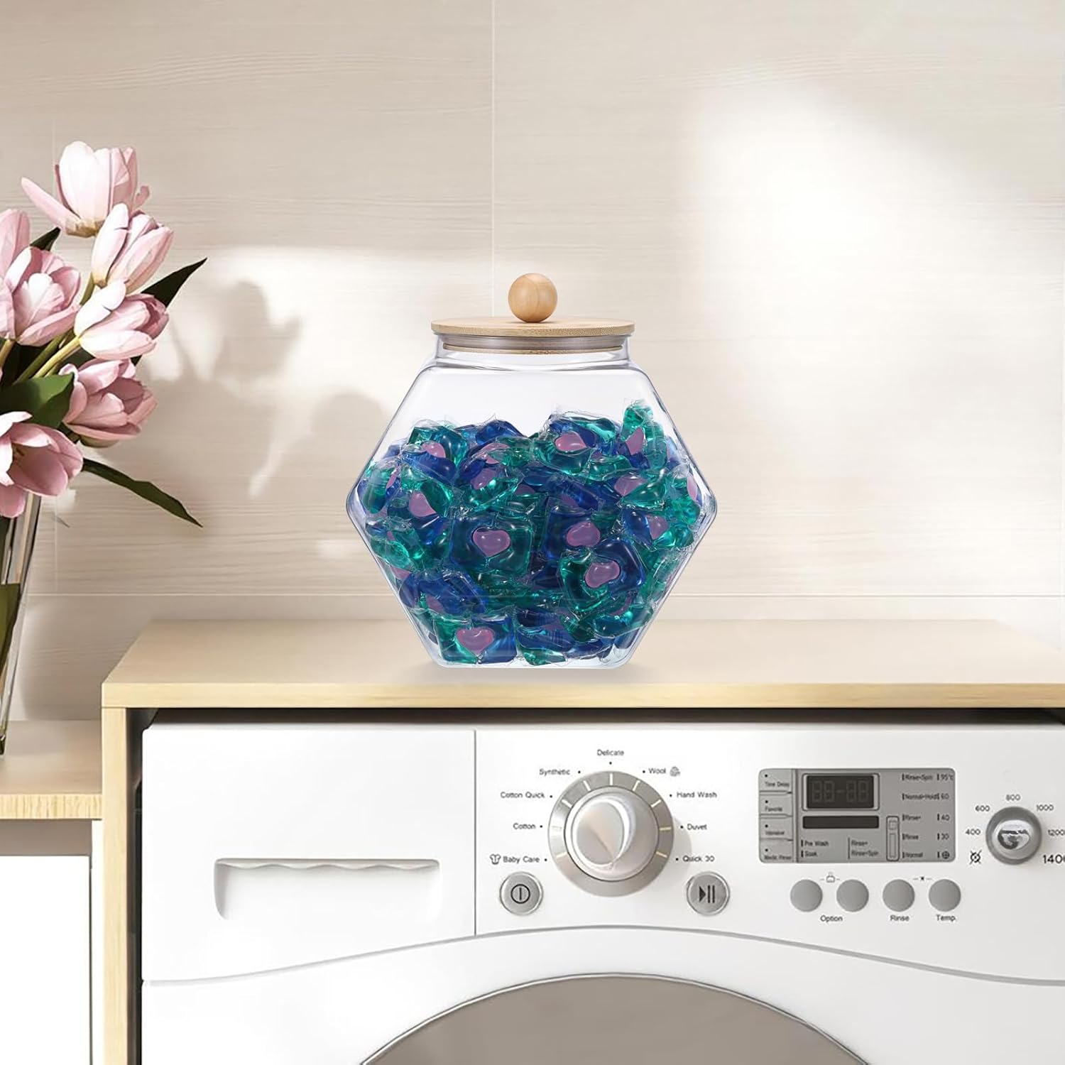 - 【Sturdy Construction with Wooden Lid】Crafted from high-quality plastic and natural wooden lid, the laundry storage container is designed for both style and practicality. The shatterproof material is better than traditional glass, ensuring safer handling for homes with children or pets. Built to withstand daily use, the reusable container is great for keeping laundry areas tidy and organized.