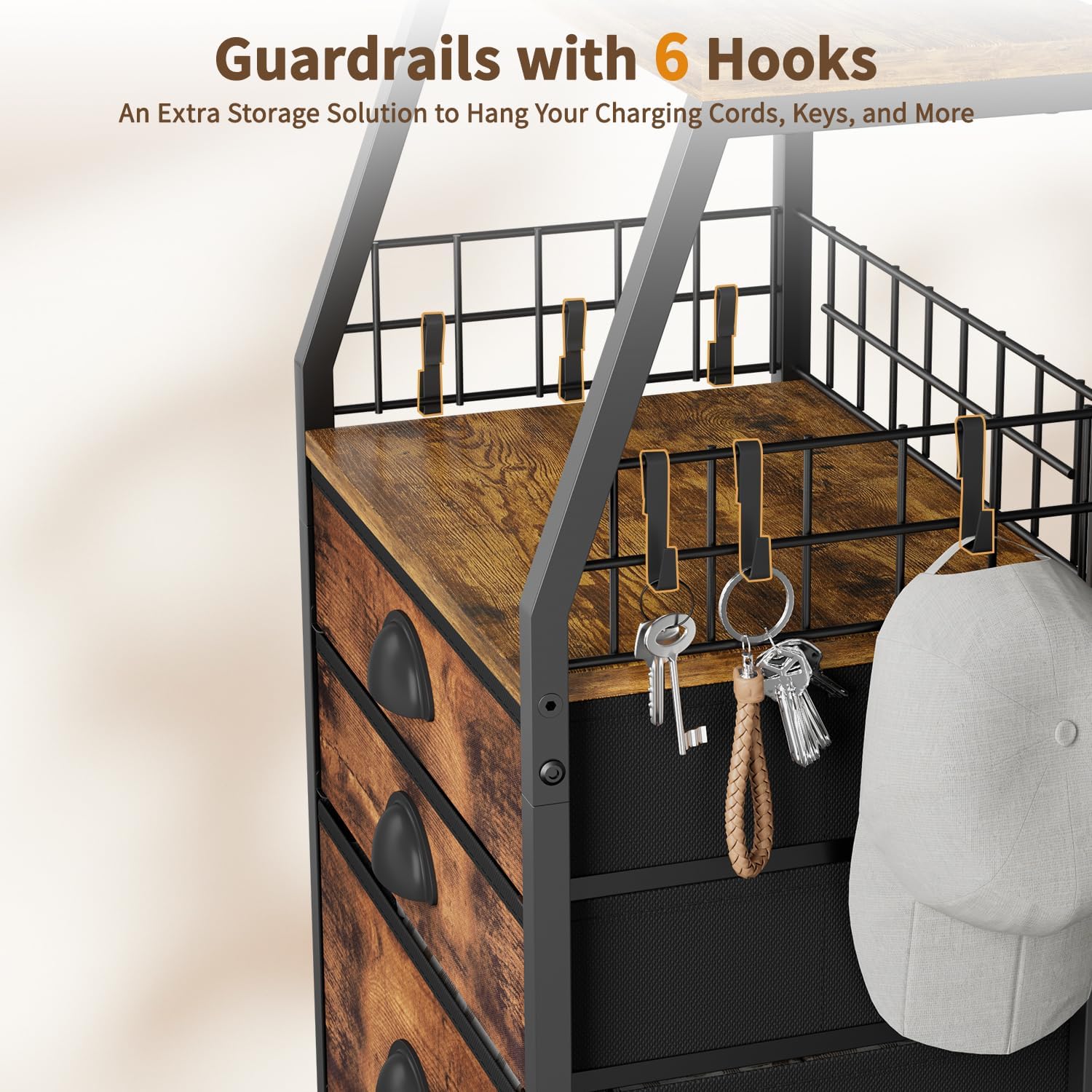 LASZOLA 3 Fabric Drawers Organizer Tower with 6 Hooks and 2 Shelves, Small End Side Table for Printer with Chest of Files Drawers, Ideal for Bedroom Living Room Office Dorm Under Desk, Rustic Bronze