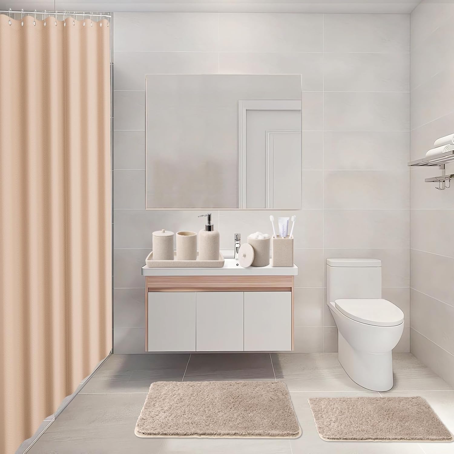 - 21 Pcs Bathroom Set - This complete farmhouse bathroom set includes a 72 "x72" waterproof shower curtain, 2 long plush highly absorbent bathroom floor mats (20 "x32"+16 "x24"), 1 soap dispenser, 1 tray, 1 toothbrush cup, 1 toothbrush holder, 2 Qtip holders, and 12 stainless steel hooks. This set is fully equipped to meet all your daily needs and make your bathroom look neat and stylish.