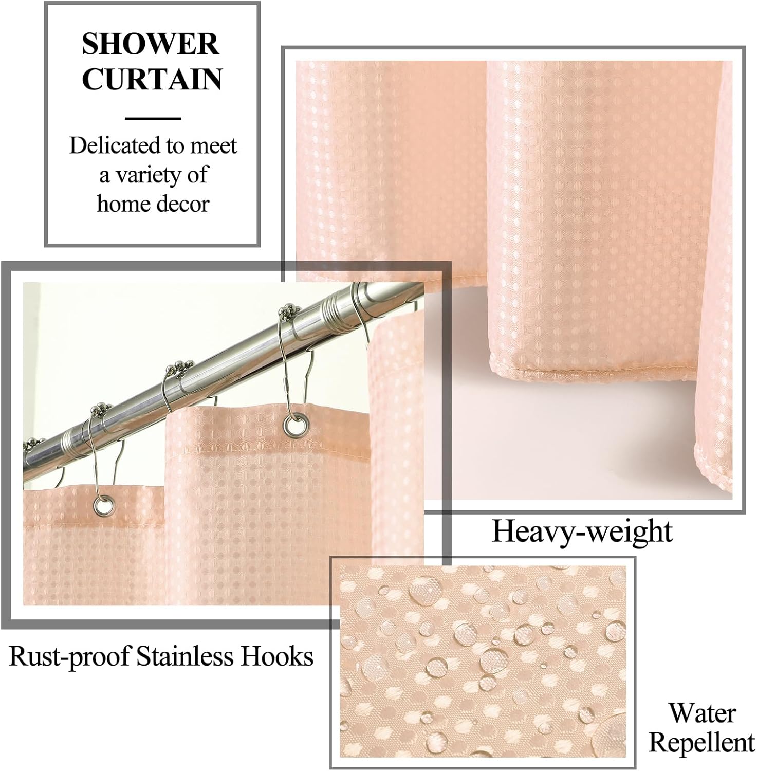 - Solid Color Waterproof Shower Curtain - This shower curtain size is designed for most showers or bathtubs and is made of high-quality polyester fabric to keep the bathroom dry. The 12 stainless steel hooks used in conjunction with the shower curtain slide smoothly and are easy to install.