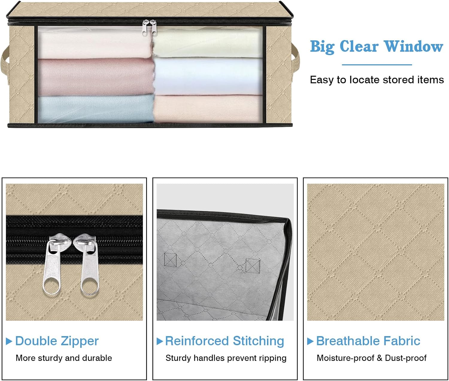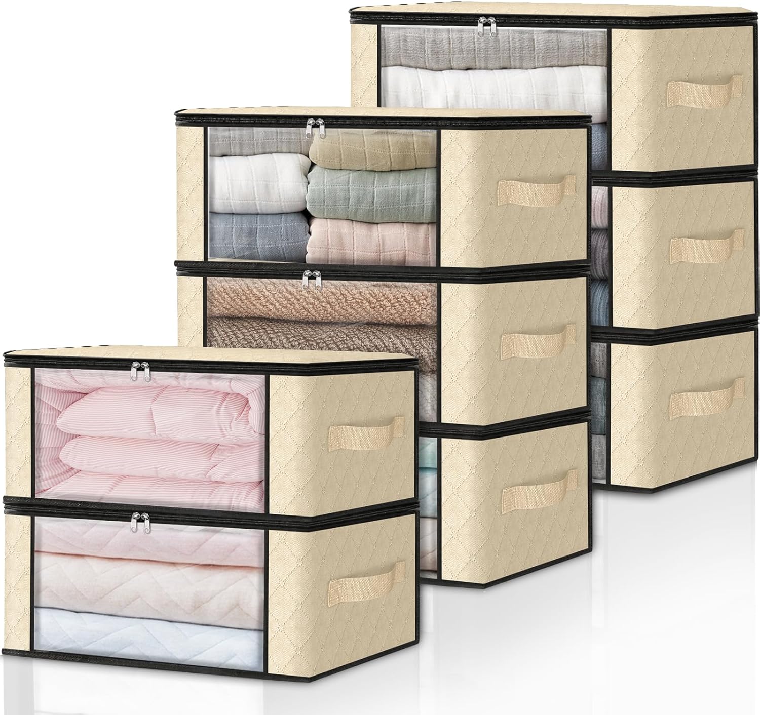 HomeHacks Storage 8-Pack Clothes Organizer Storage Bags Foldable Storage Box with Large Clear Window Sturdy Handles for Closet, Dorm, Pillows, Bedding, Clothes, Blankets, 35L, Beige