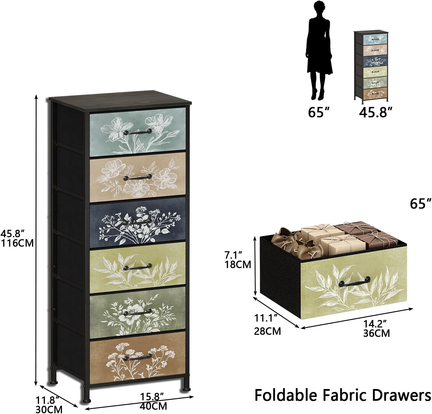 Tohomeor Vintage Dresser Vertical Nightstand with Neutral Botanical Plant Fabric Chest Drawers for Closet Bathroom Storage Tower Unit Bed Side Organizer Farmhouse Rustic (Multi, 6 Drawers)