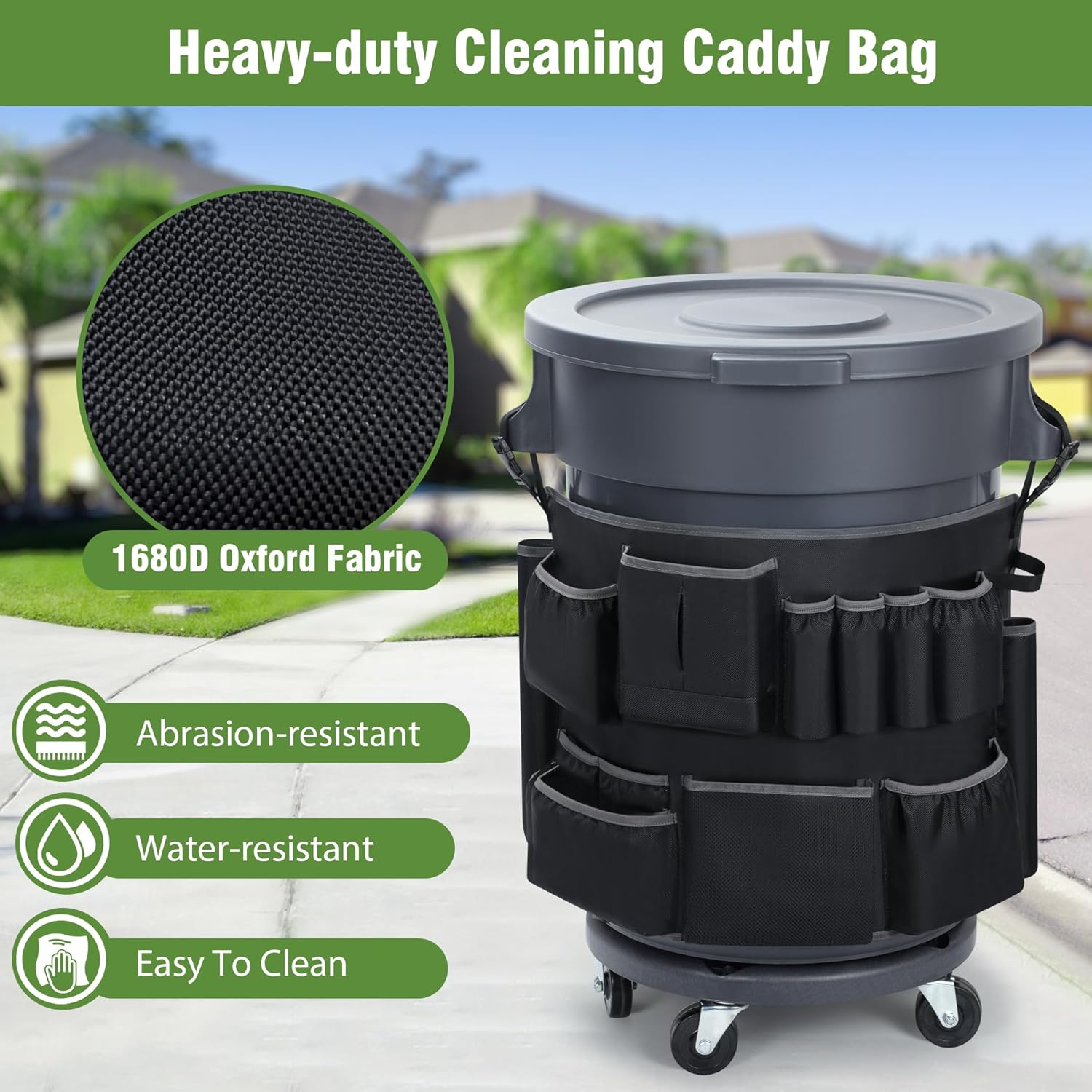 - Large Roomy: The trash can caddy bag is specially designed with multiple storage pockets organizer offers ample storage for all essential cleaning tools and supplies, such as storing spray cleaners, cleaning brushes, wiping towels, rubbish bags, small brooms and other daily cleaning tools, easy to access. Which makes your cleaning work more organised and improves the tidiness of your work area