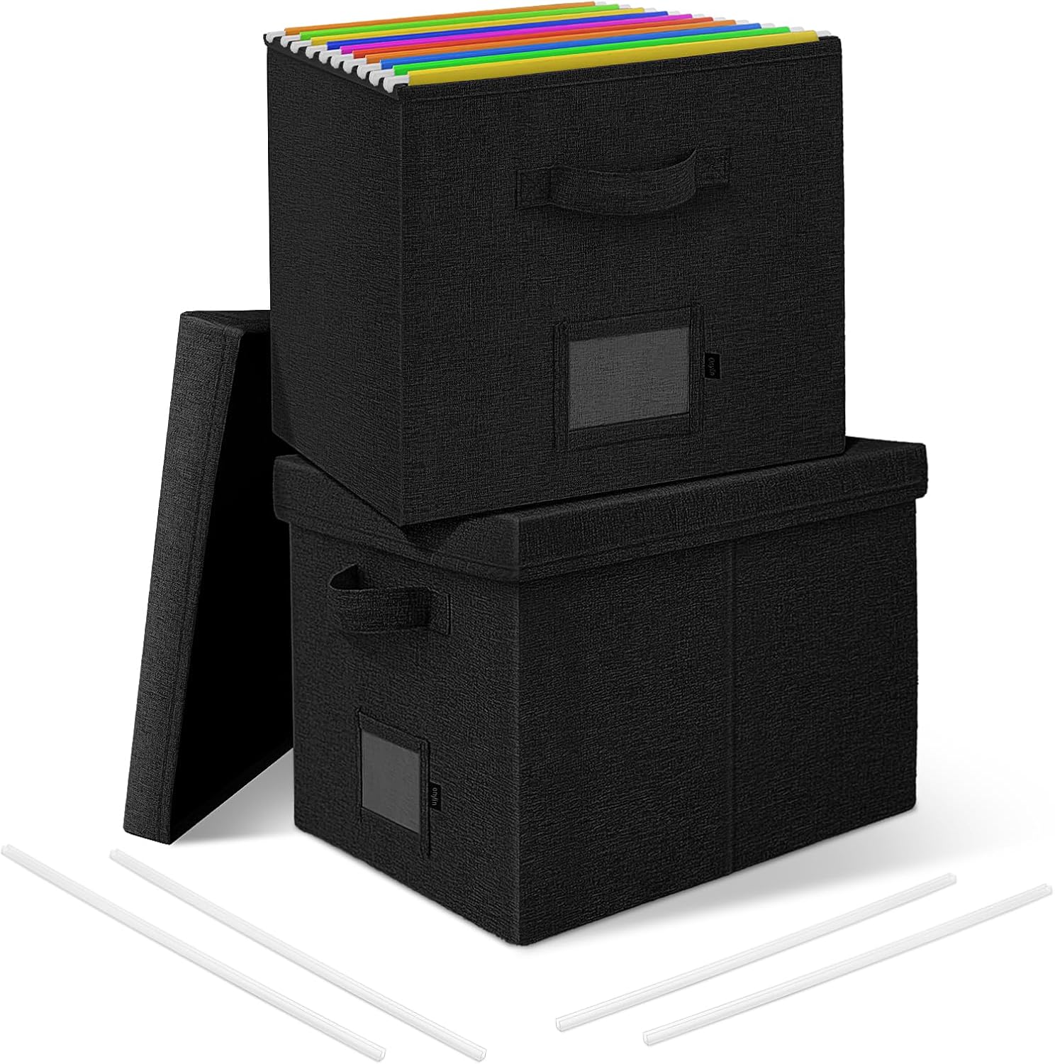 File Organizer Boxes with Lid, Linen Hanging File Storage Boxes with Handle, Collapsible Document Filling Boxes for Letter/Legal Folder, Portable File Box for Office/Decor/Home (2 Pack, Black)