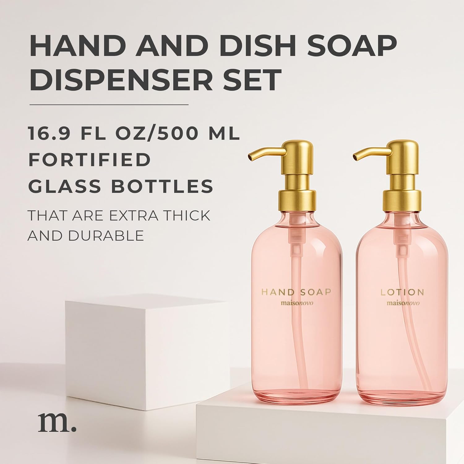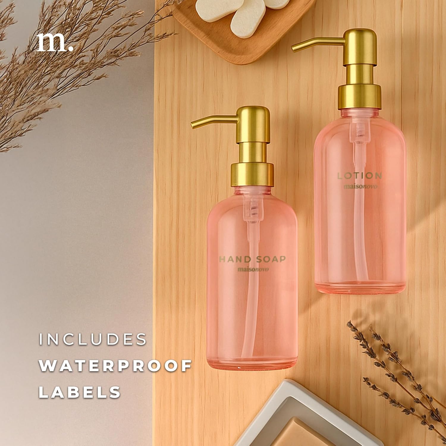 MaisoNovo Soap Dispenser 2-Piece Set | 16.9oz Pink Bottles with Gold Stainless Steel Pumps