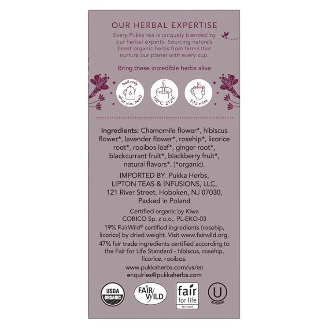 - PUKKA NIGHT TIME BERRY: Indulge in this organic tea crafted with fruity elderberry and blackcurrant ingredients blended with the subtle floral notes of echinacea, chamomile, and lavender and the sweet tones of licorice and valerian