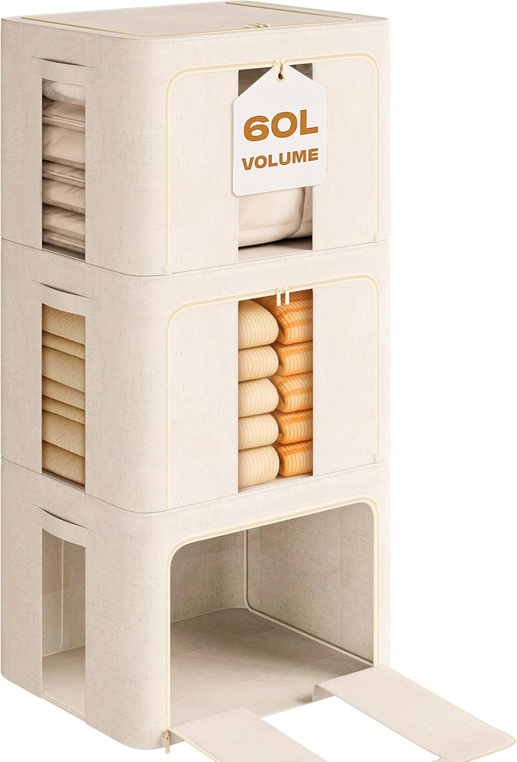 3Pack 60L Large Cloth Storage Bins with Metal Frame, Linen Storage Box with Clear Window, Stackable Sweater Storage for Closet, Clothes Containers for Comforters, Blankets, Quilts, T-shirt