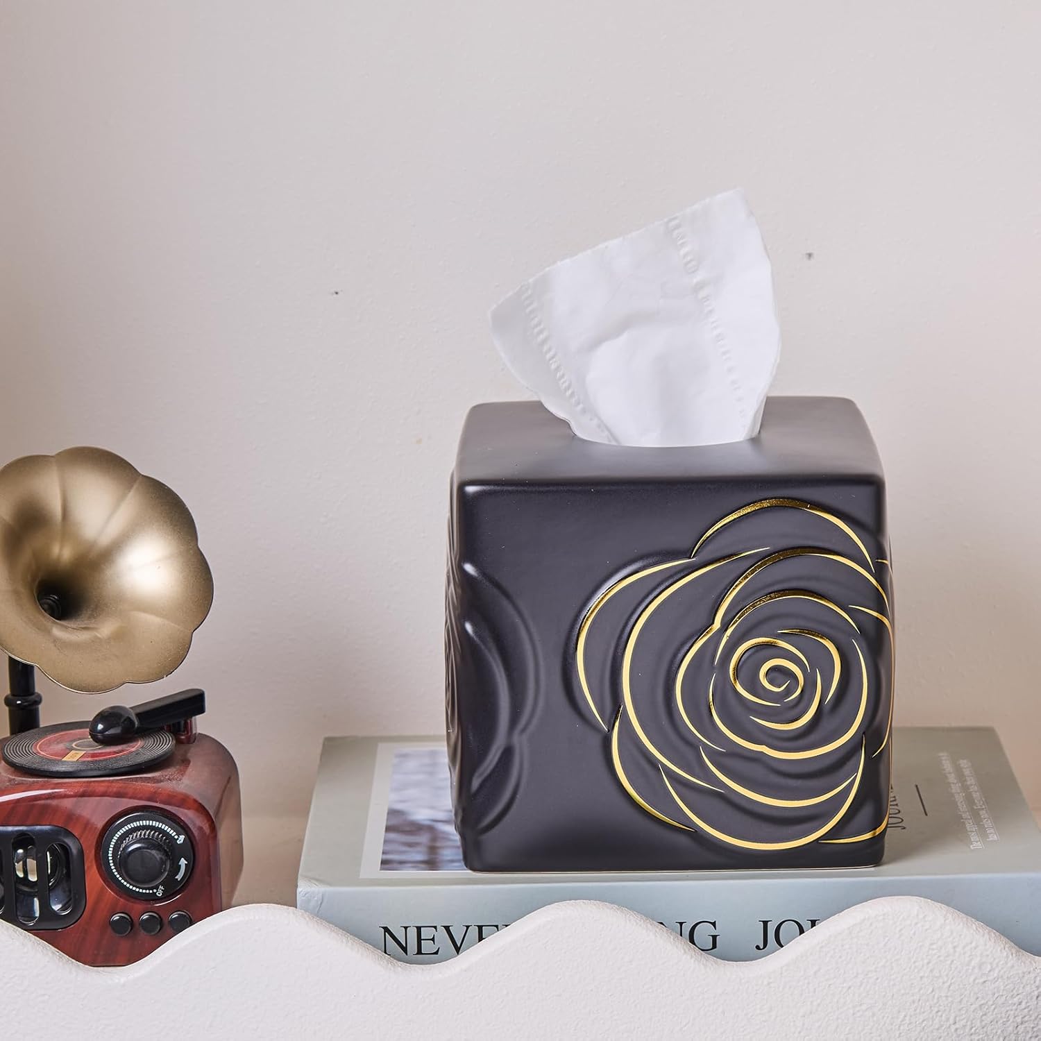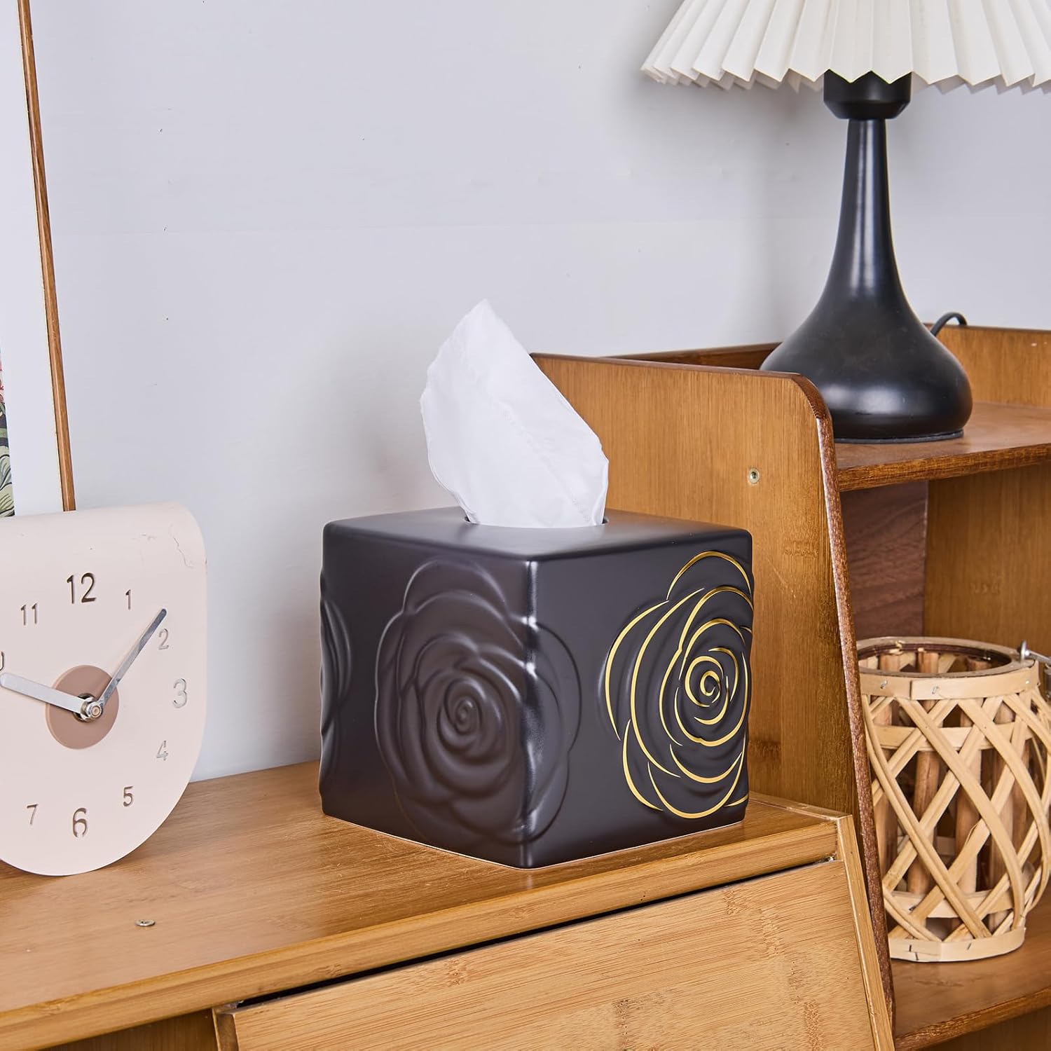 Black Ceramic Cube Tissue Box Cover with Gold Rose – Large Elegant Rose Floral Square Decorative Tissue Box Holder for Bathroom, Bedroom, Office Desk, Kitchen Counter – Perfect Housewarming Gift