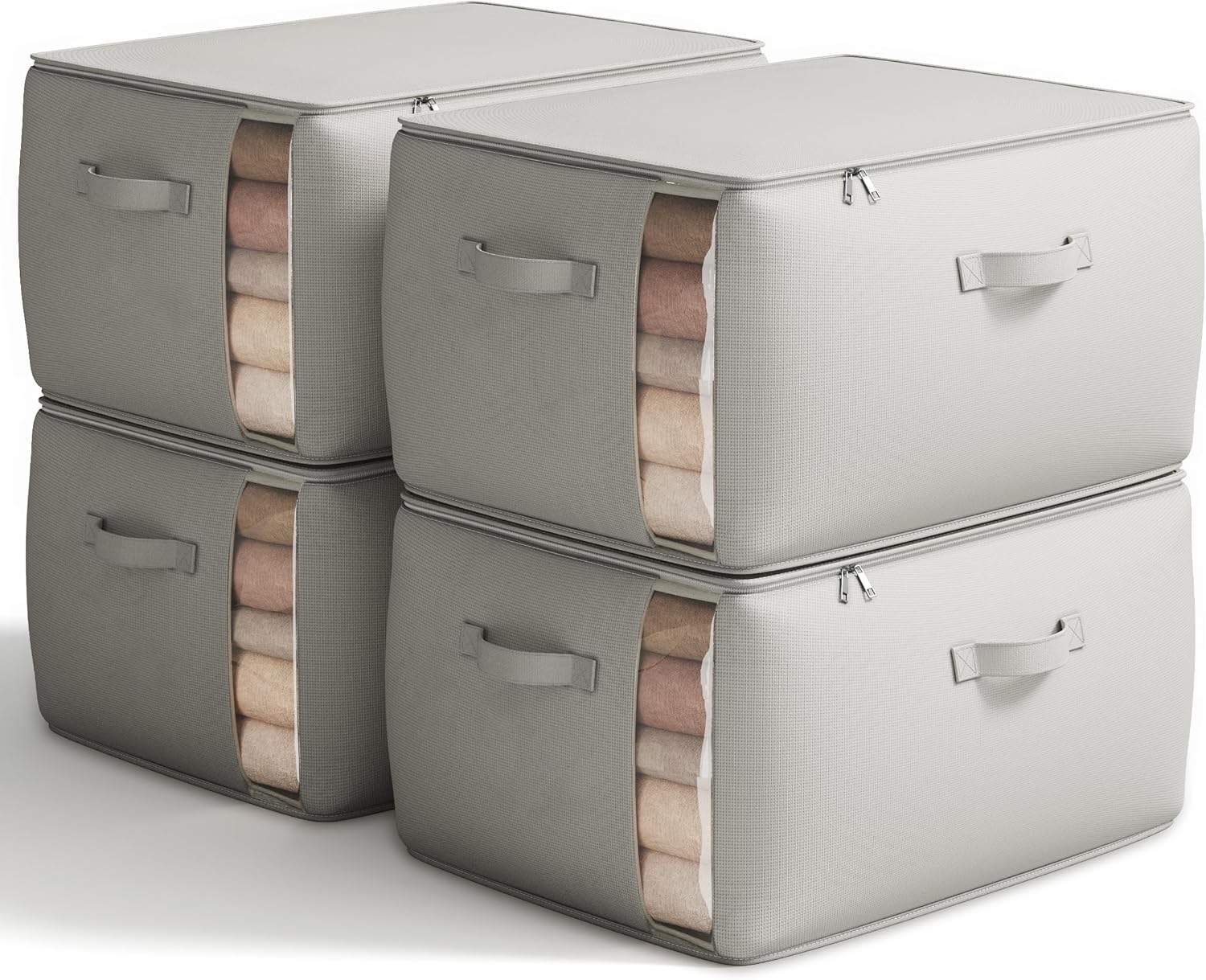 Vailando Large Canvas Comforter Storage Bags Closet Organizer for Clothes Sweater Clothes Organizer with Dual Zipper Three Carrying Handles for Blanket Closet Storage Container, 4 Pack, Grey