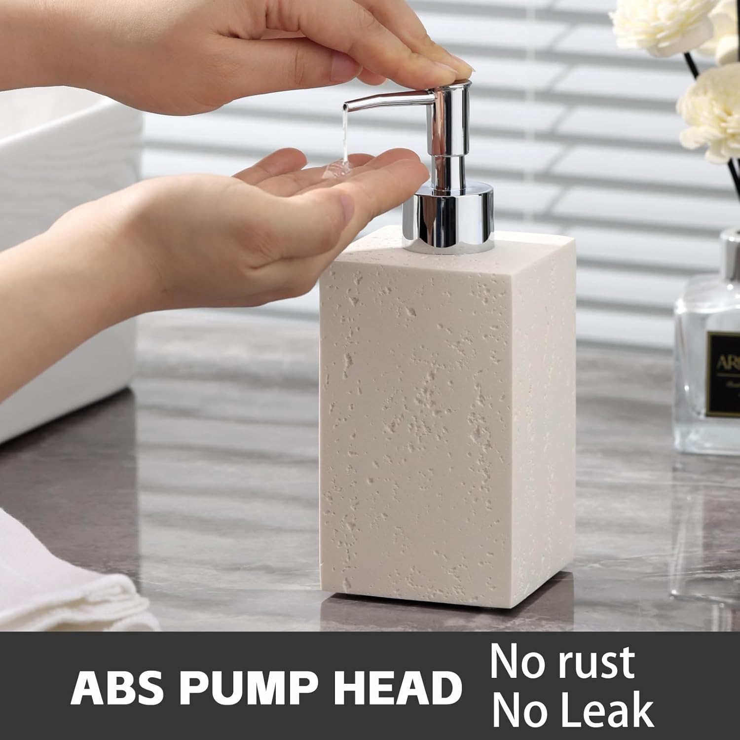 - GOOD QUALITY: Dish soap dispenser is made of thickened high quality resin, weight about 1.25LB, sturdy, reusable, non-slip and environmentally friendly. Travertine stone design with a silver rustproof pump show it luxurious and practical you can easily squeeze out the liquid and no leaking or dripping.