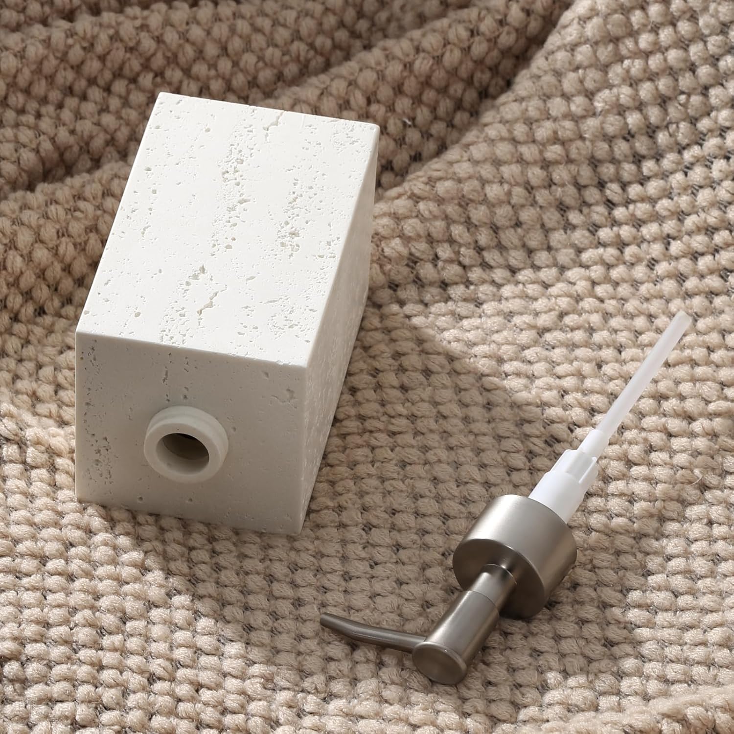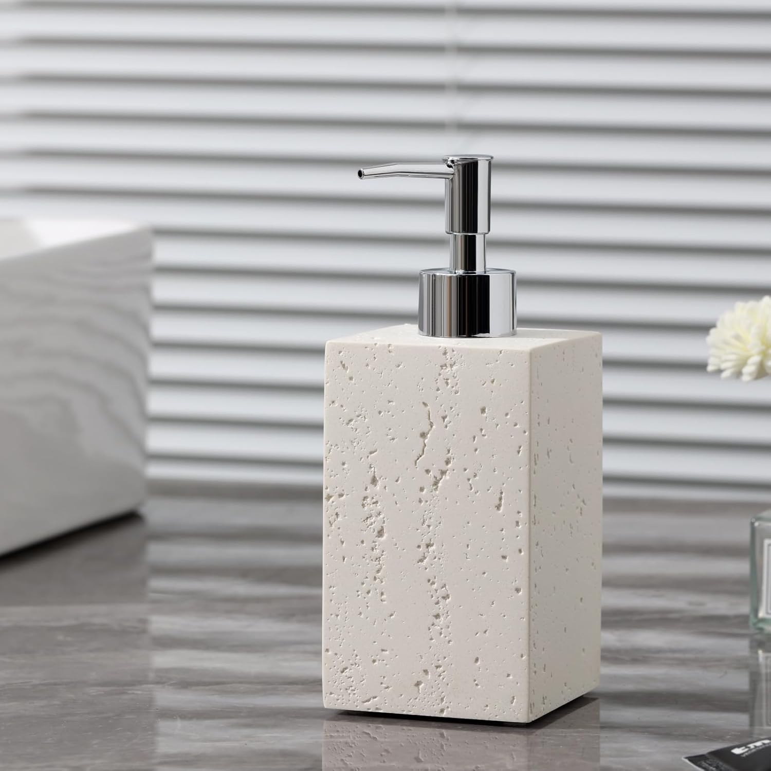 - ATTRACTIVE BATHROOM ACCESSORIES: Luxurious and unique travertine stone texture bathroom soap dispenser with silver rustproof pump. Lovely way to bring visual texture to your bathroom countertop or kitchen sink.