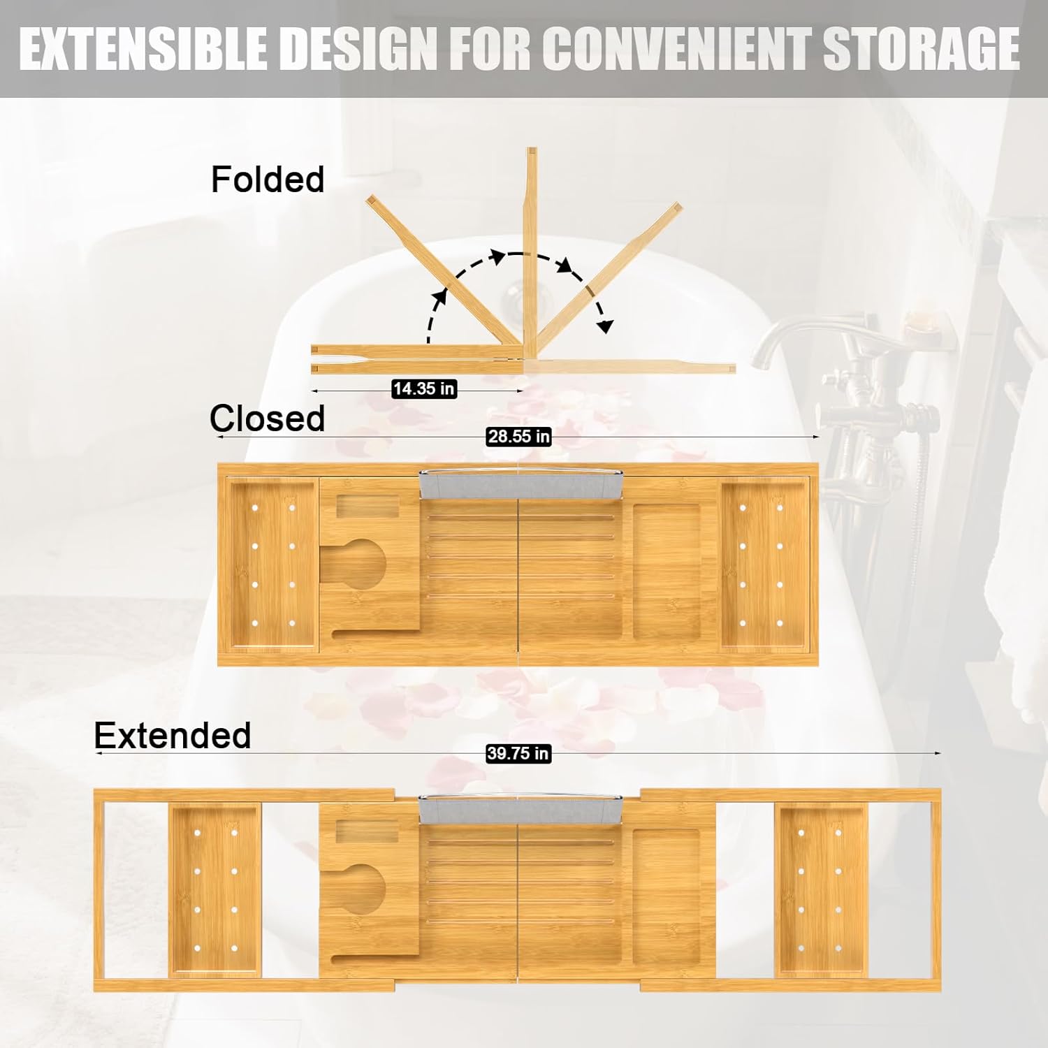 - FITS STANDARD BATHTUB: Our bamboo bath tray for tub was specifically designed to expand from 28.5 inches to 39.7 inches, fits all standard roman bathtub,you just need to manually adjust it to the right length and don't need any tools.