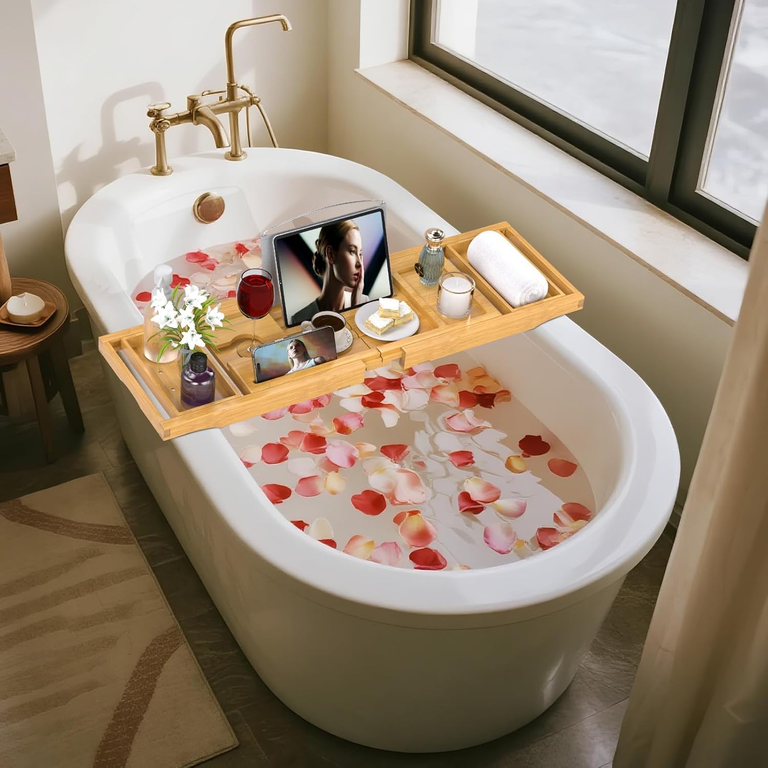 Bathtub Tray Caddy, Expandable Bath Trays for Tub, Bamboo Shelf & Table with Wine Glass Holder,Bathroom Accessories for New Home & Mothers Day & Birthday Gifts for Mom