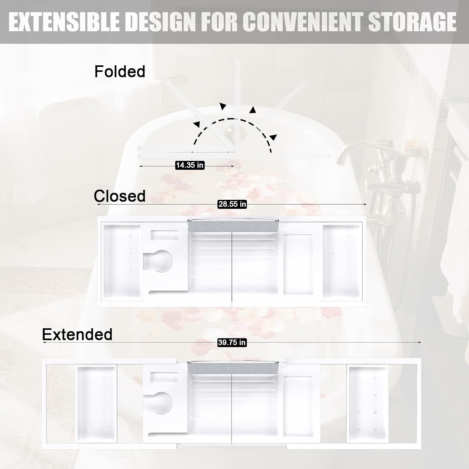 Bathtub Tray Caddy, Expandable Bath Trays for Tub, Bamboo Shelf & Table with Wine Glass Holder,Bathroom Accessories for New Home & Mothers Day & Birthday Gifts for Mom,White