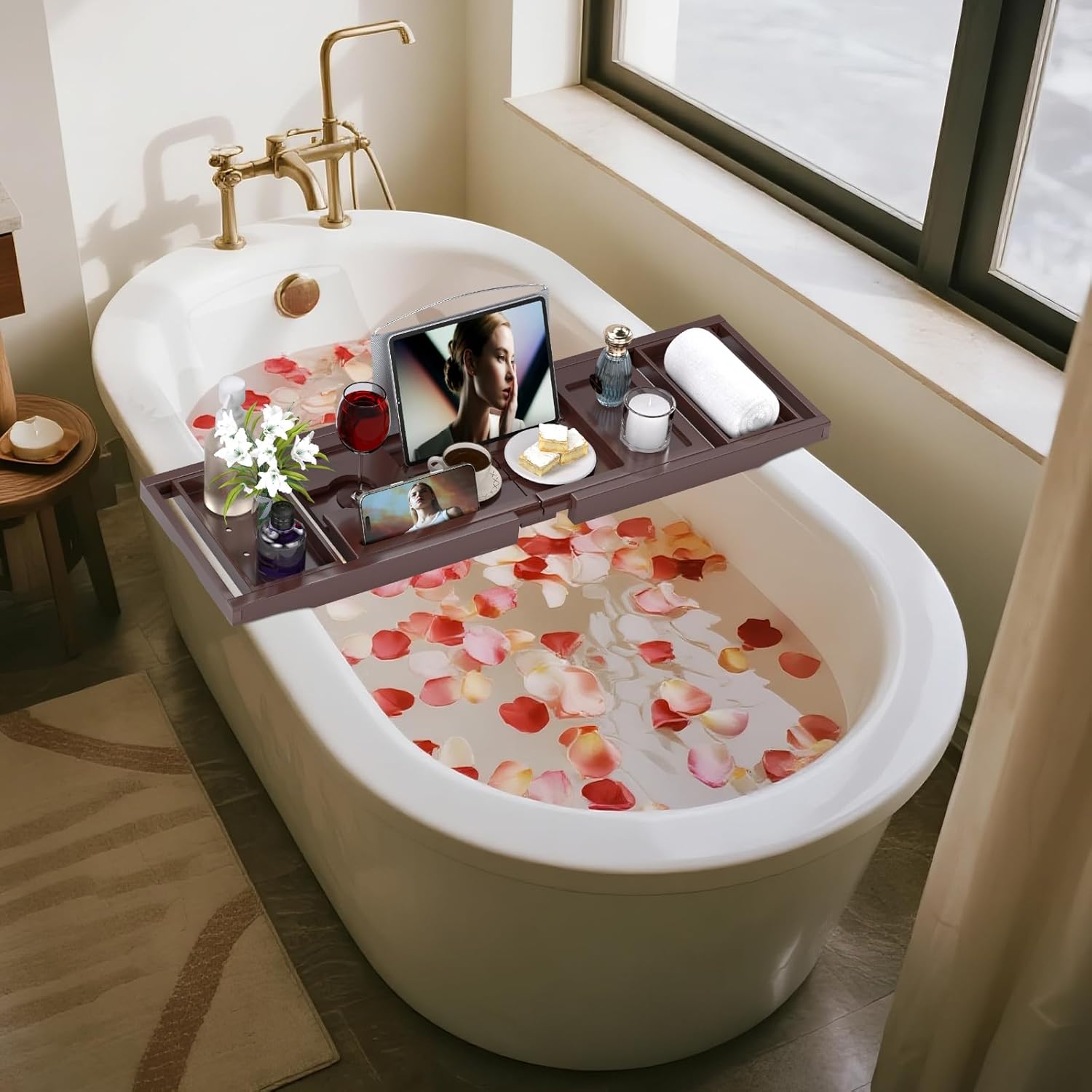 - RELAX IN BATH TIME: Create a luxury at-home spa with our beautifully-designed adjustable bathtub tray for tub.Melt your cares away pampering yourself in a relaxing bath with this tub tray and any bathtub accessory you desire!