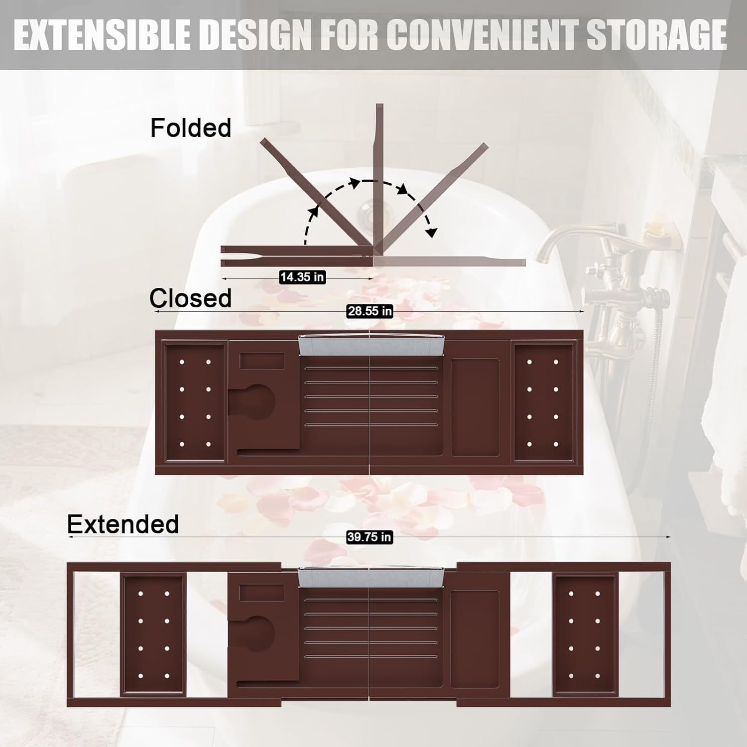 - FITS STANDARD BATHTUB: Our bamboo bath tray for tub was specifically designed to expand from 28.5 inches to 39.7 inches, fits all standard roman bathtub,you just need to manually adjust it to the right length and don't need any tools.