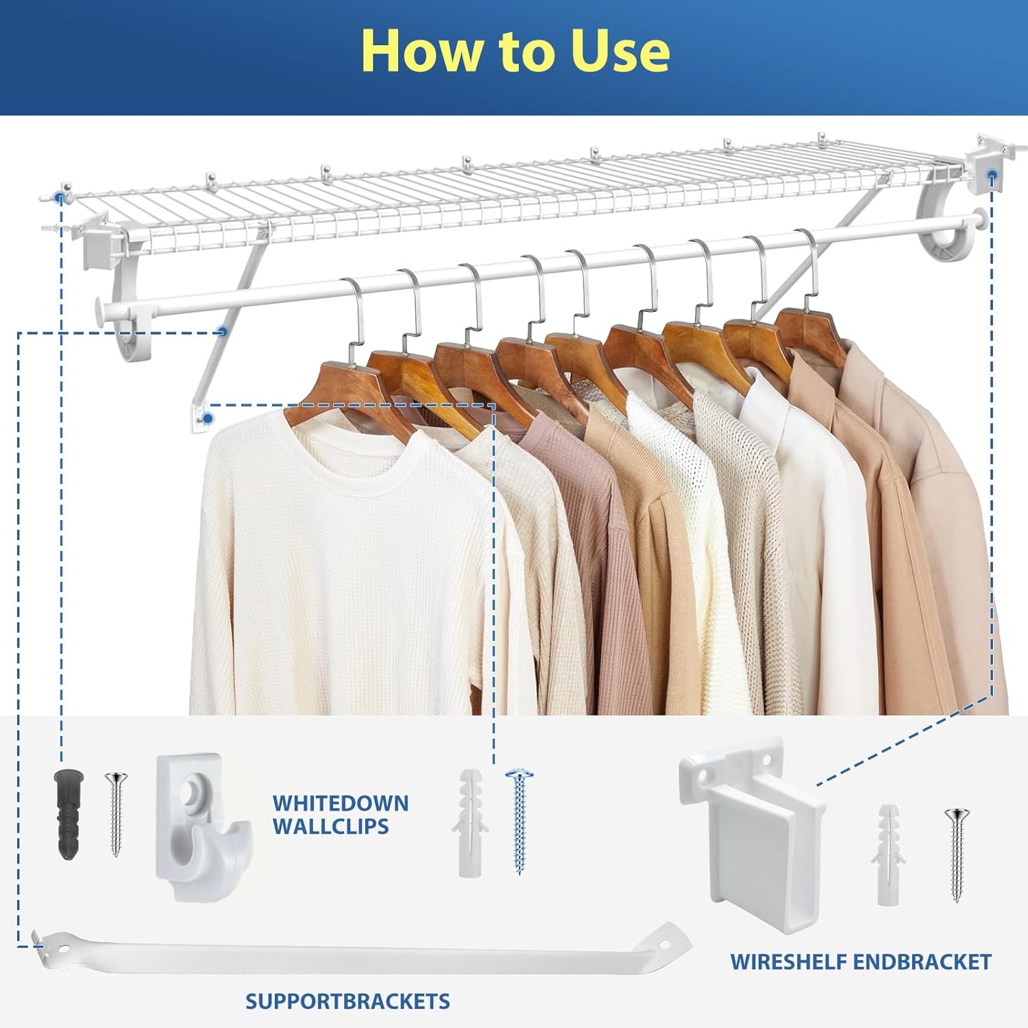 - Iron & Durable:The closet brackets are made from high-quality iron material, with a surface treated with an epoxy-coated steel finish. The closet wire shelf is durable and rust-resistant, making it an ideal choice for clothing storage