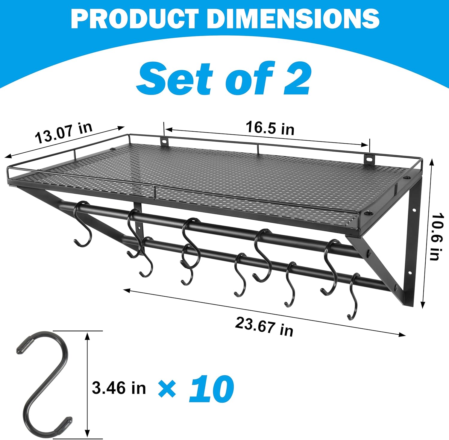 - Wall Shelves Set of 2: Providing a large amount of storage space, frees up more floor space, and makes the cluttered garage neat and organized. The items hanging on the wall is clearly visible, allowing for easy access to the necessary one and improve work efficiency.