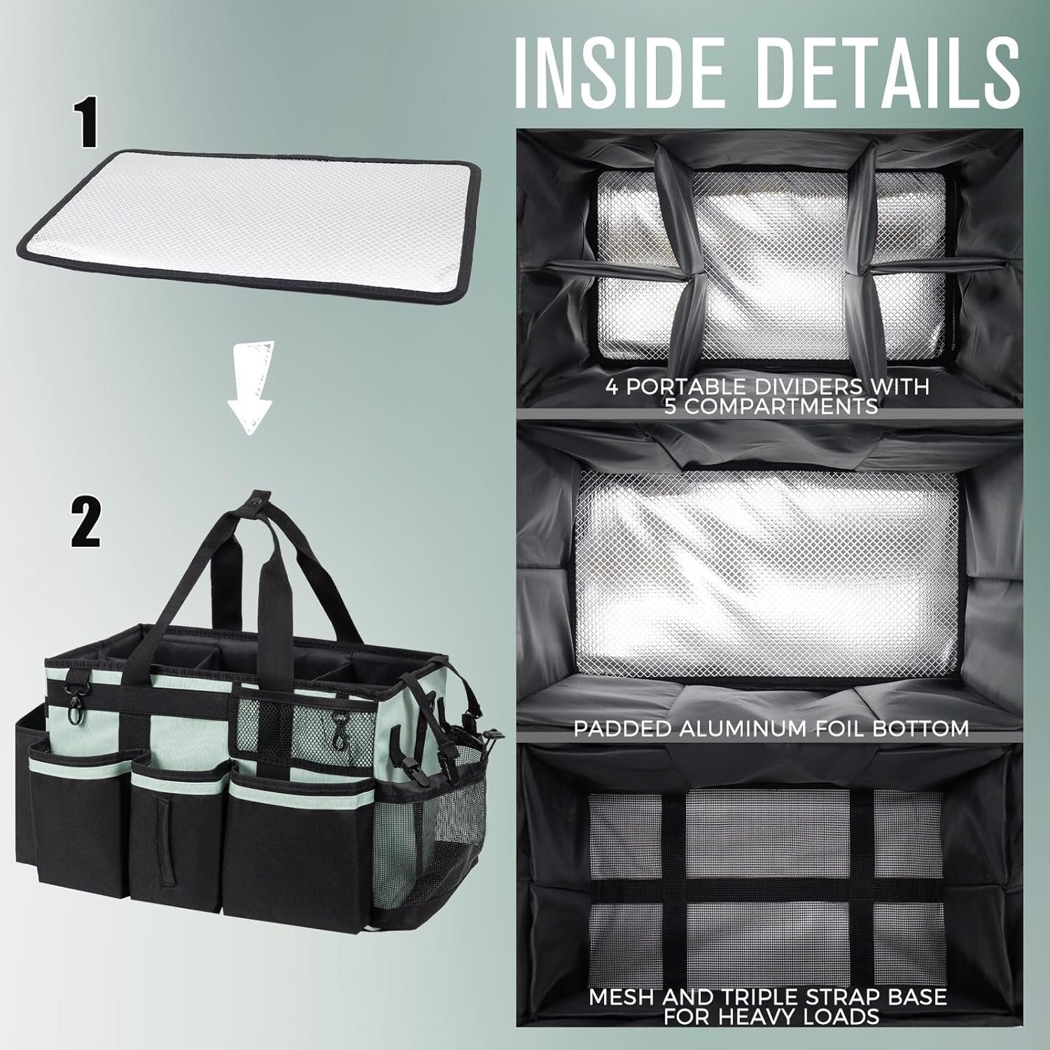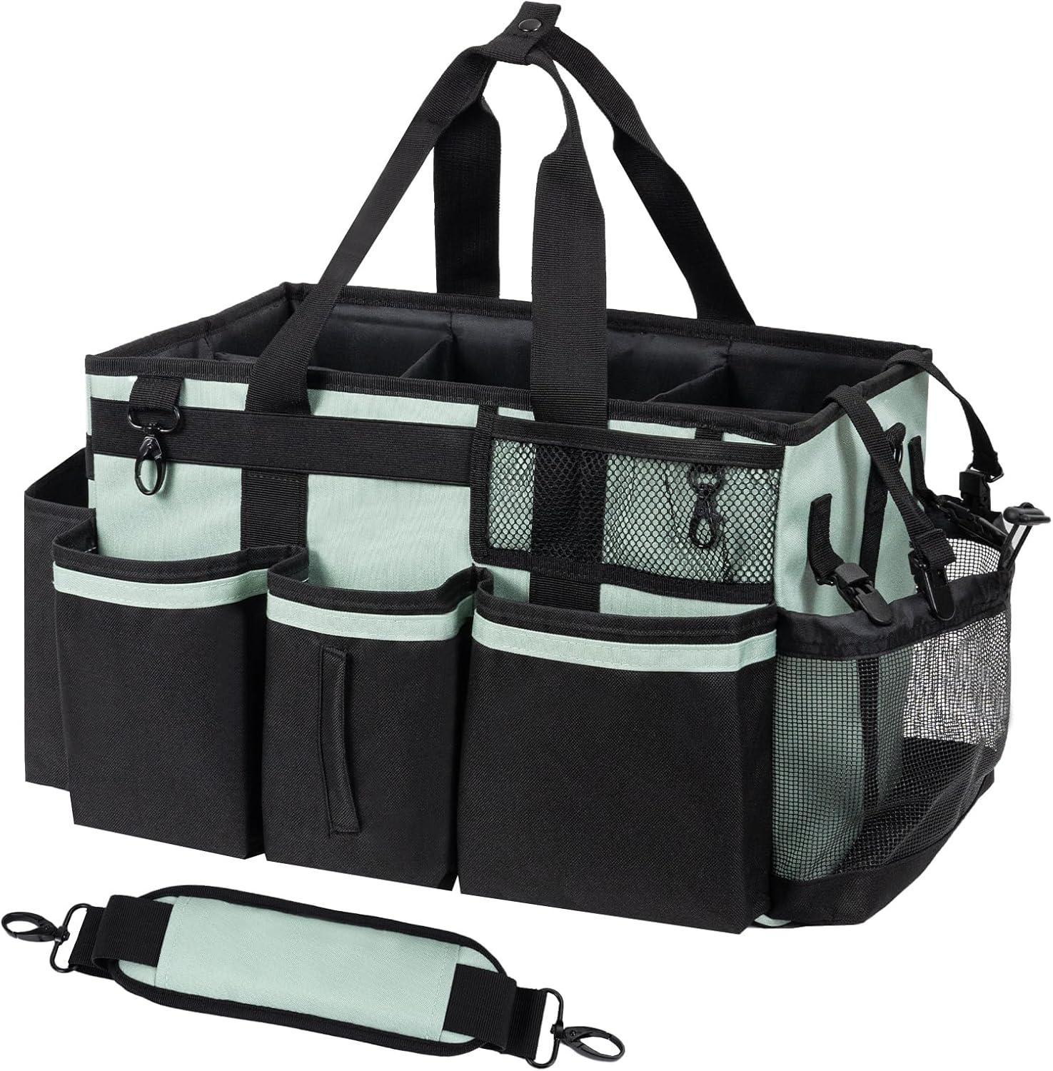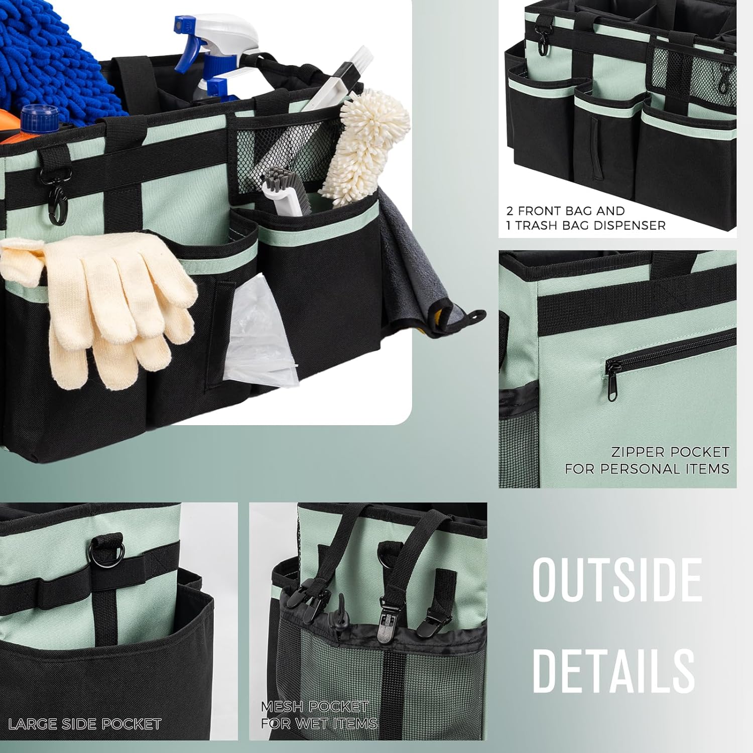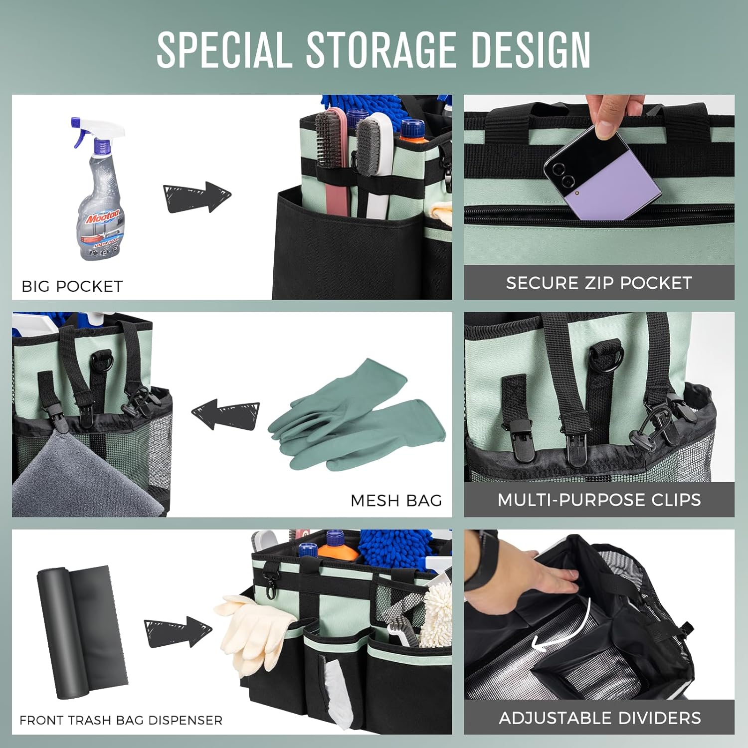 Wearable Cleaning Caddy, Cleaning Caddy Supplies Organizer with Handle & Shoulder Straps for Housekeepers, Under Sink & Car Cleaning Tool Organizers Bag with 4 Foldable Divider (Celadon)