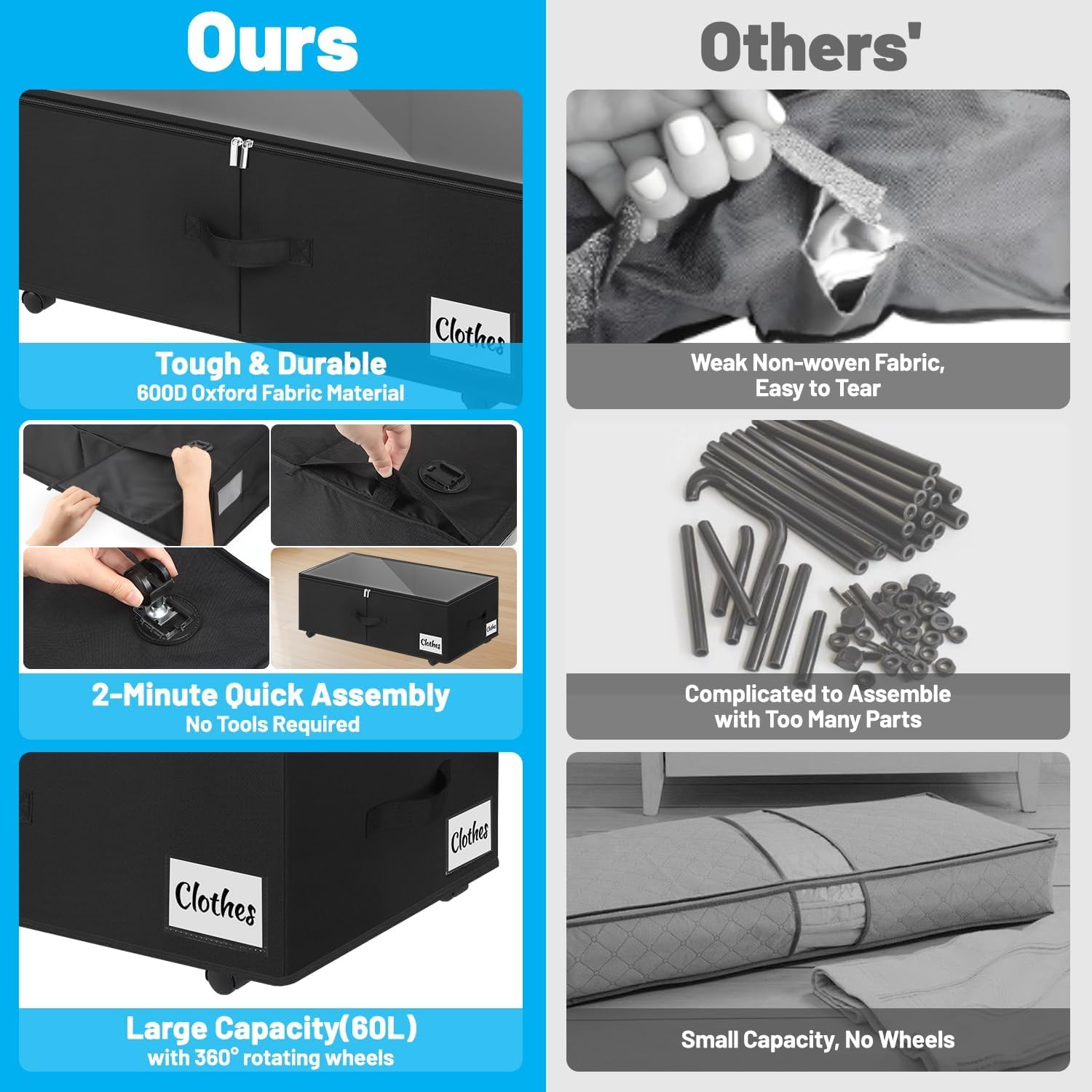 - SMOOTH-ROLLING 360° SILENT WHEELS: Say goodbye to lifting heavy bins!Each under bed storage container features 5 smooth-rolling wheels and 3 reinforced fabric handles for easy pulling. Whether on hardwood or carpet, adults and kids can move them effortlessly without straining.
