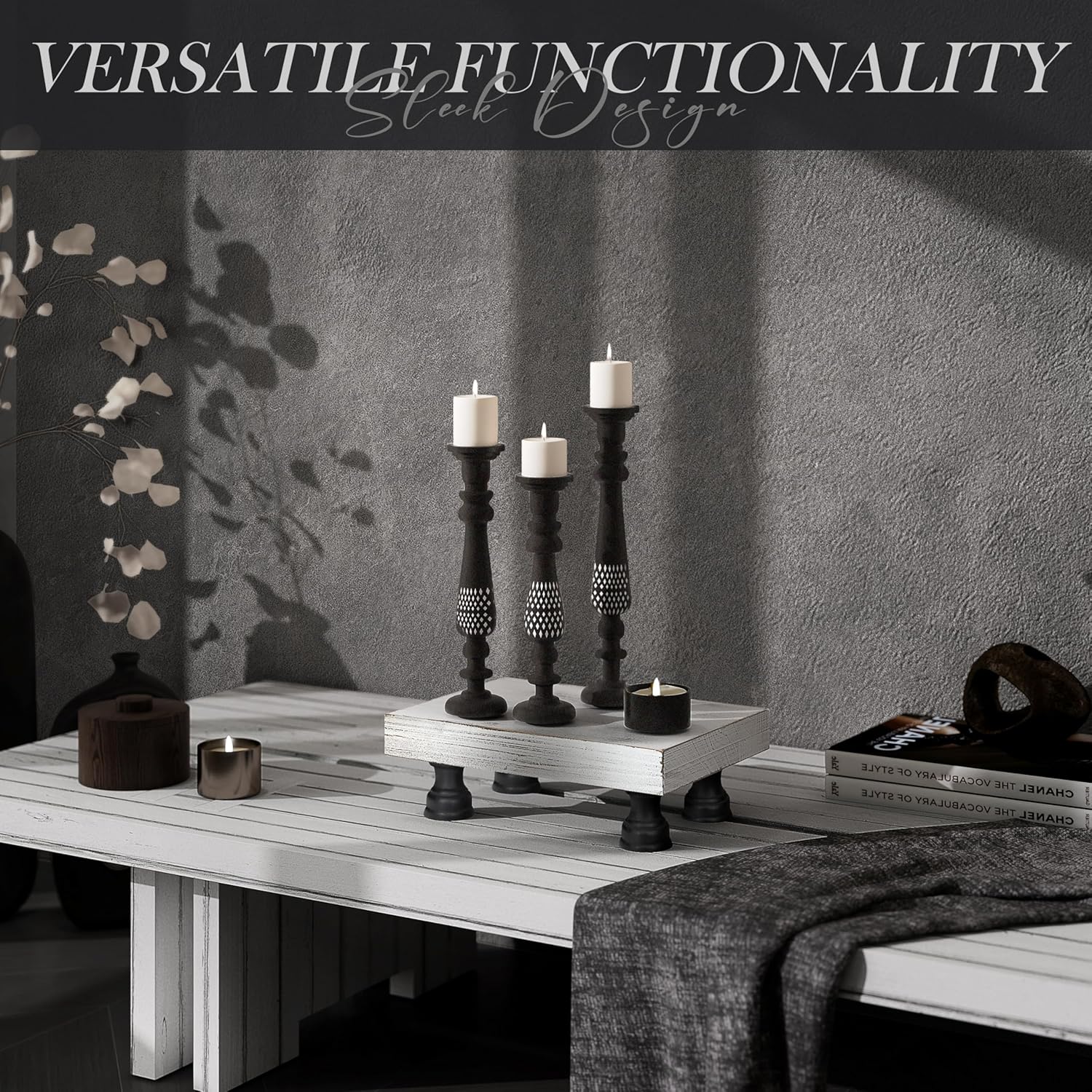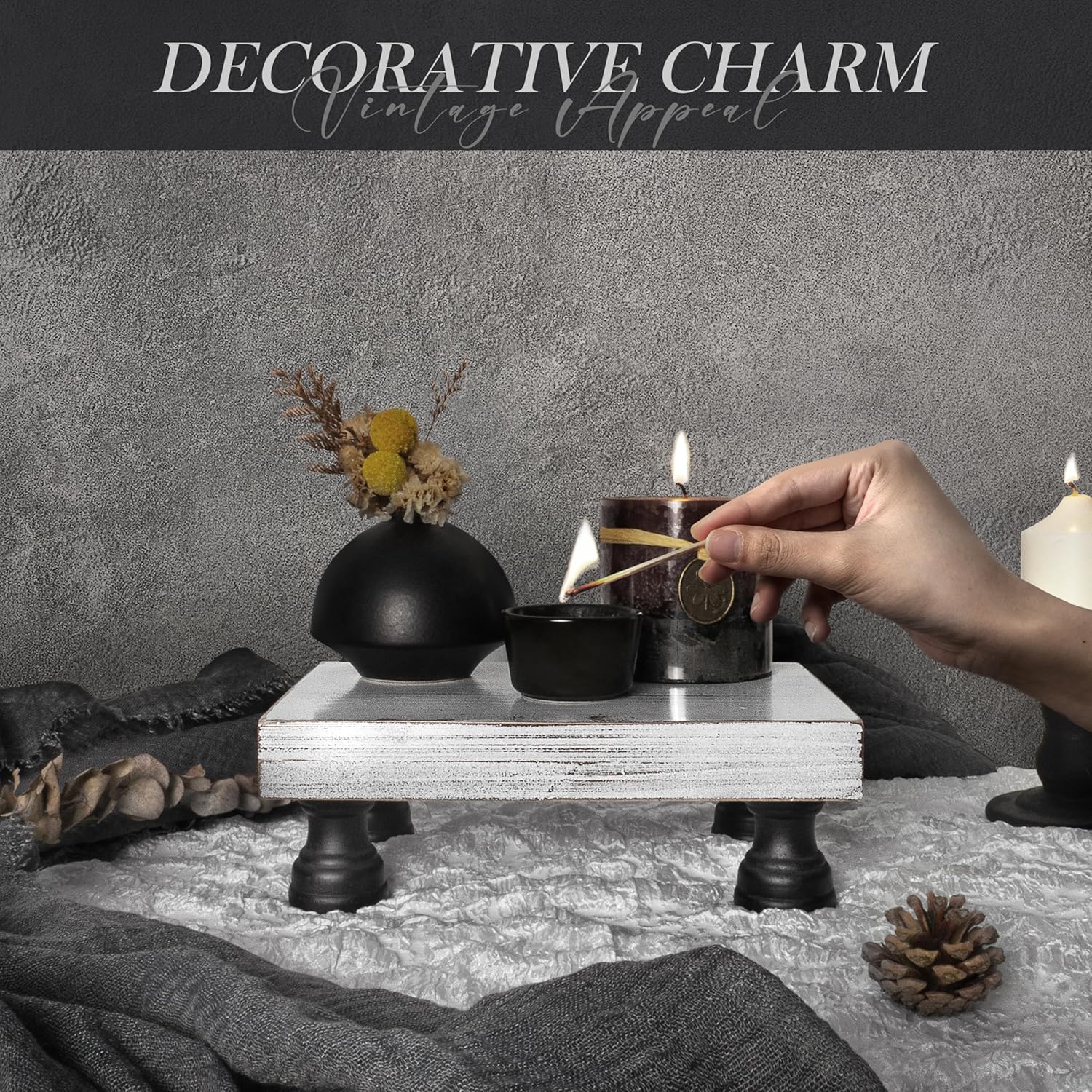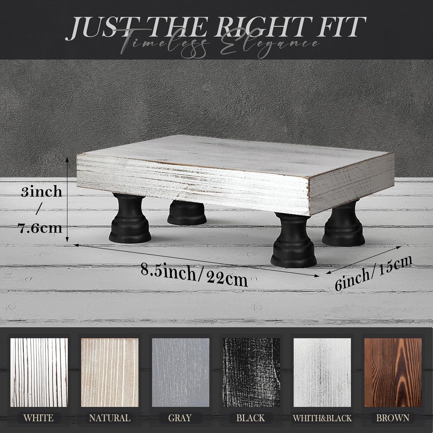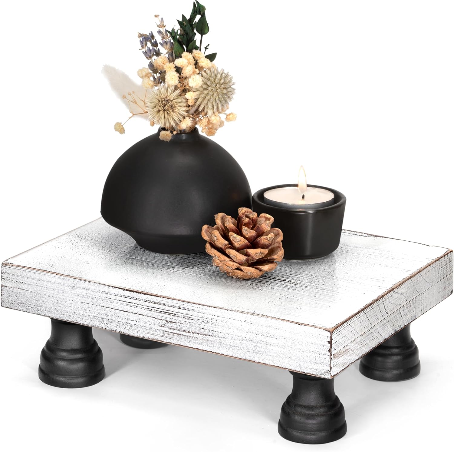 - [ELEVATE YOUR INTERIORS] Transform your home decor with sophisticated black and white fir wood display risers (8.5*6). Featuring a sleek white pedestal stand supported by four sturdy black legs, this wooden riser brings a modern yet inviting flair to your farmhouse decor, enhancing the ambiance of your kitchen, bathroom, or living room.