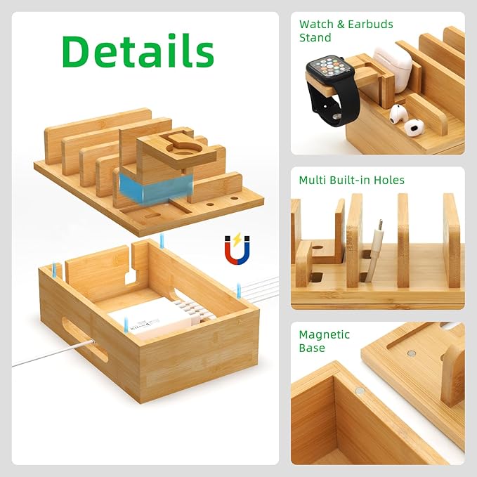 - Premium Bamboo: Crafted from natural bamboo, the natural texture and feel make this charging station not just functional but also a stylish addition to your desk. Make charging a pleasure