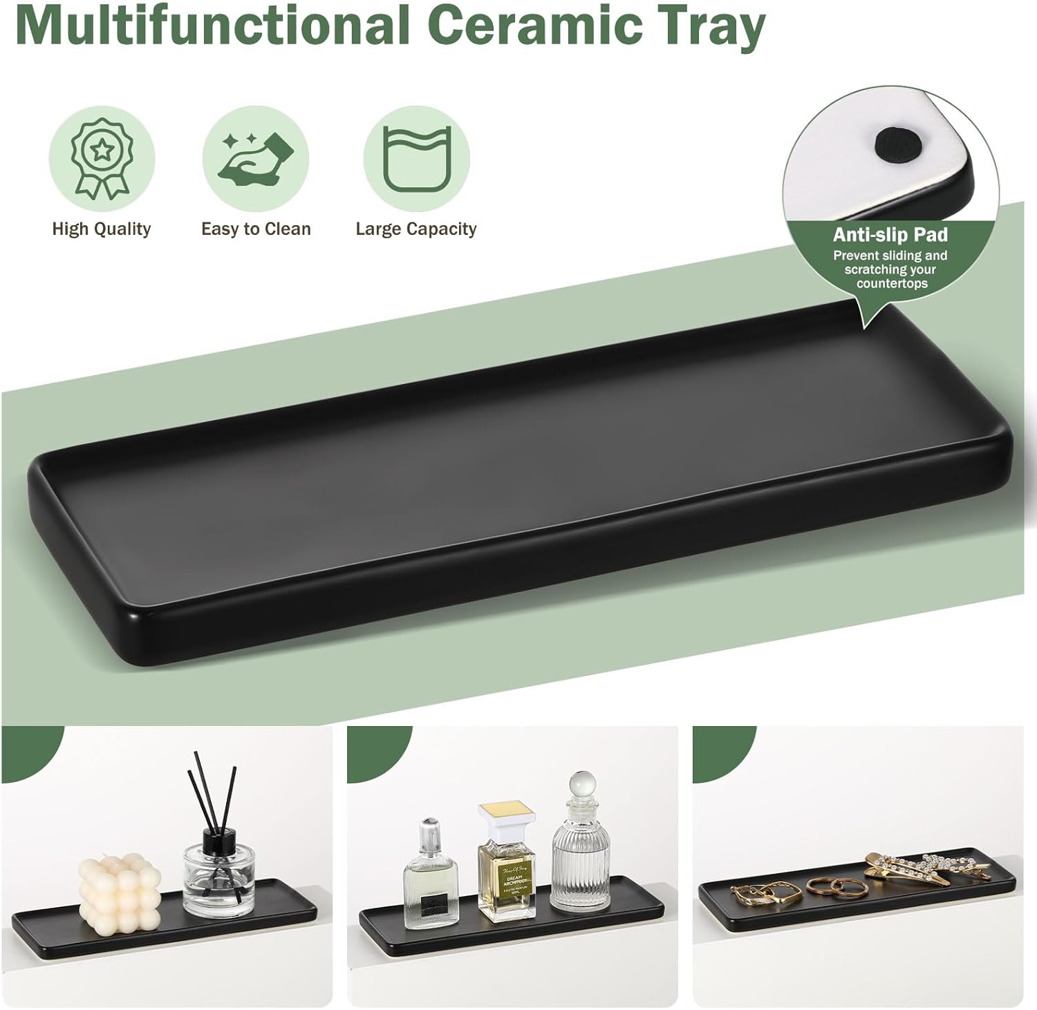 - Premium Ceramic Tray: Our bathroom vanity tray is made of high quality ceramic with a classic matte black finish that is elegant, sturdy and easy to clean. It is perfect for your soap dispensers, perfume bottles, lotions, candles, jewelry, toiletries, earrings, towels and other small items, keeping your items in one place and saving your countertop space.