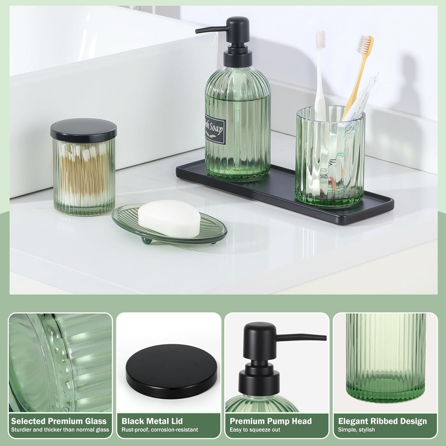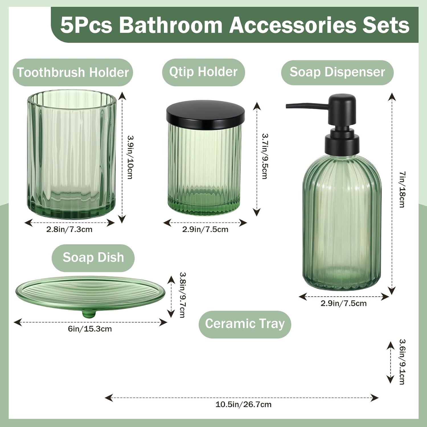 Shinowa Bathroom Accessories Set, 5 Pcs Clear Glass Bathroom Accessory Sets Complete with Soap Dispenser, Toothbrush Holder, Q-Tips Holder, Soap Dish, Ceramic Tray, Vanity Organizer, Green