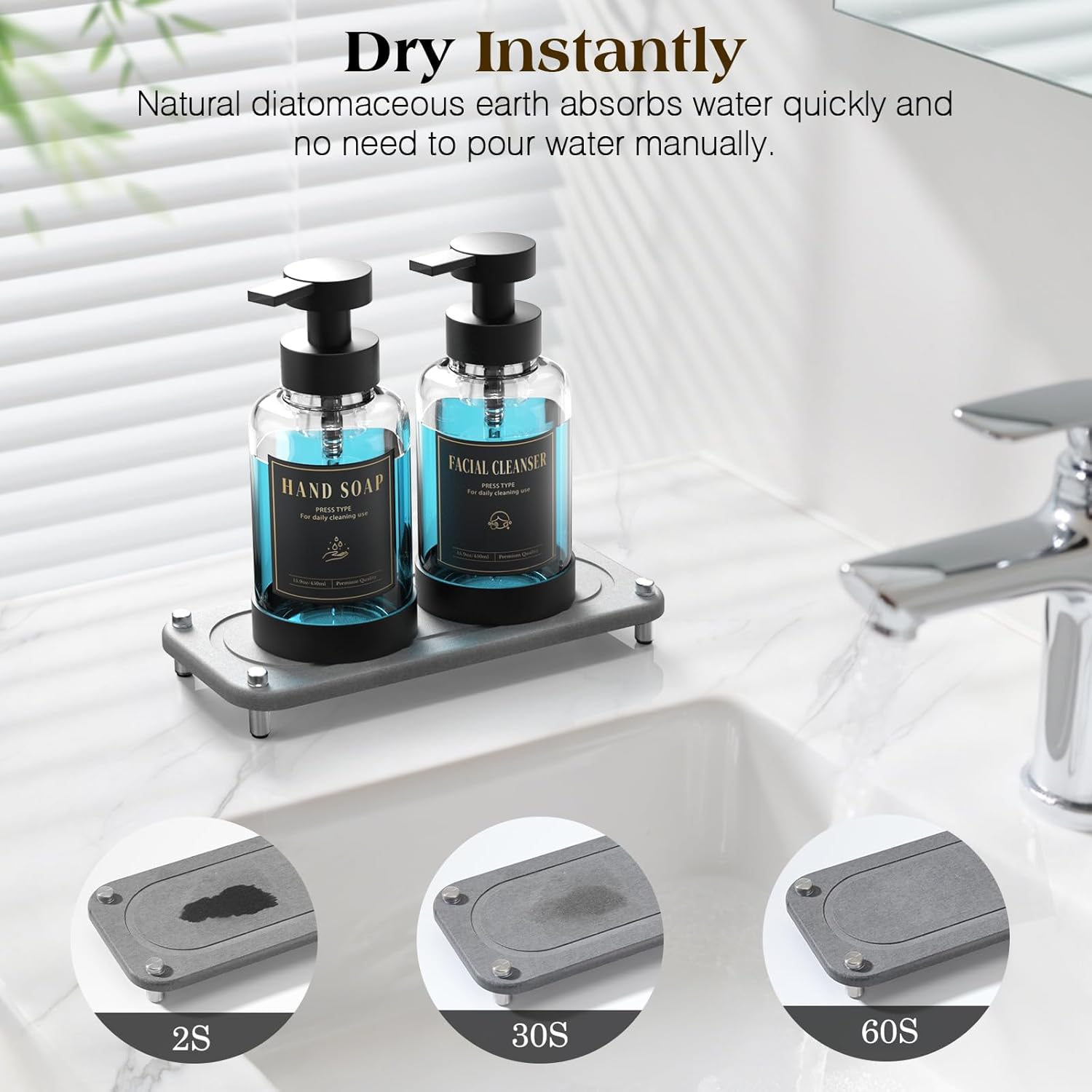 - Superior Materials: This pump bottom dispenser is made of glass, smooth and delicate, and can be restored as new by simple wiping. Equipped with a silicone protective sleeve, it is non-slip, scratch-resistant, and shatterproof, so you can use it with confidence. Diatomaceous earth tray quickly absorbs excess moisture to ensure that countertops remain clean, dry and hygienic.