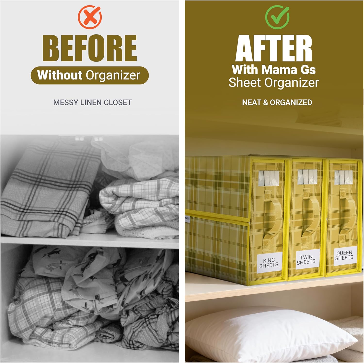 - Keep Your Bedding Neatly Stored: Say goodbye to messily folded sheets and keep your bedding stored compactly and neatly with Mama Gs sheet storage organizer! Featuring a sturdy construction with zippers, these sheet organizers ensure compact and effective storage.