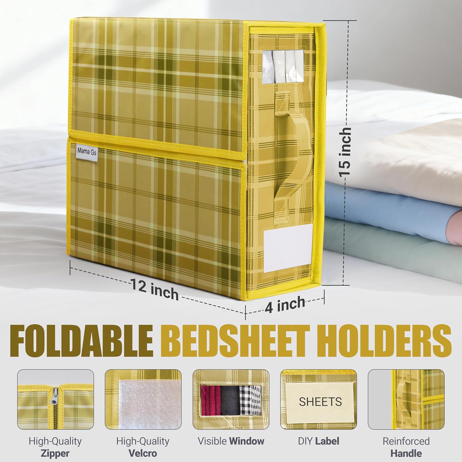 Bed Sheet Organizer Set of 4 – Plaid Sheet Storage 15"x12"x4" – Foldable Bedsheet Holders with Zipper, Window – Closet Organizer for Bedding Storage, Pillows, Duvets, Linen – Yellow