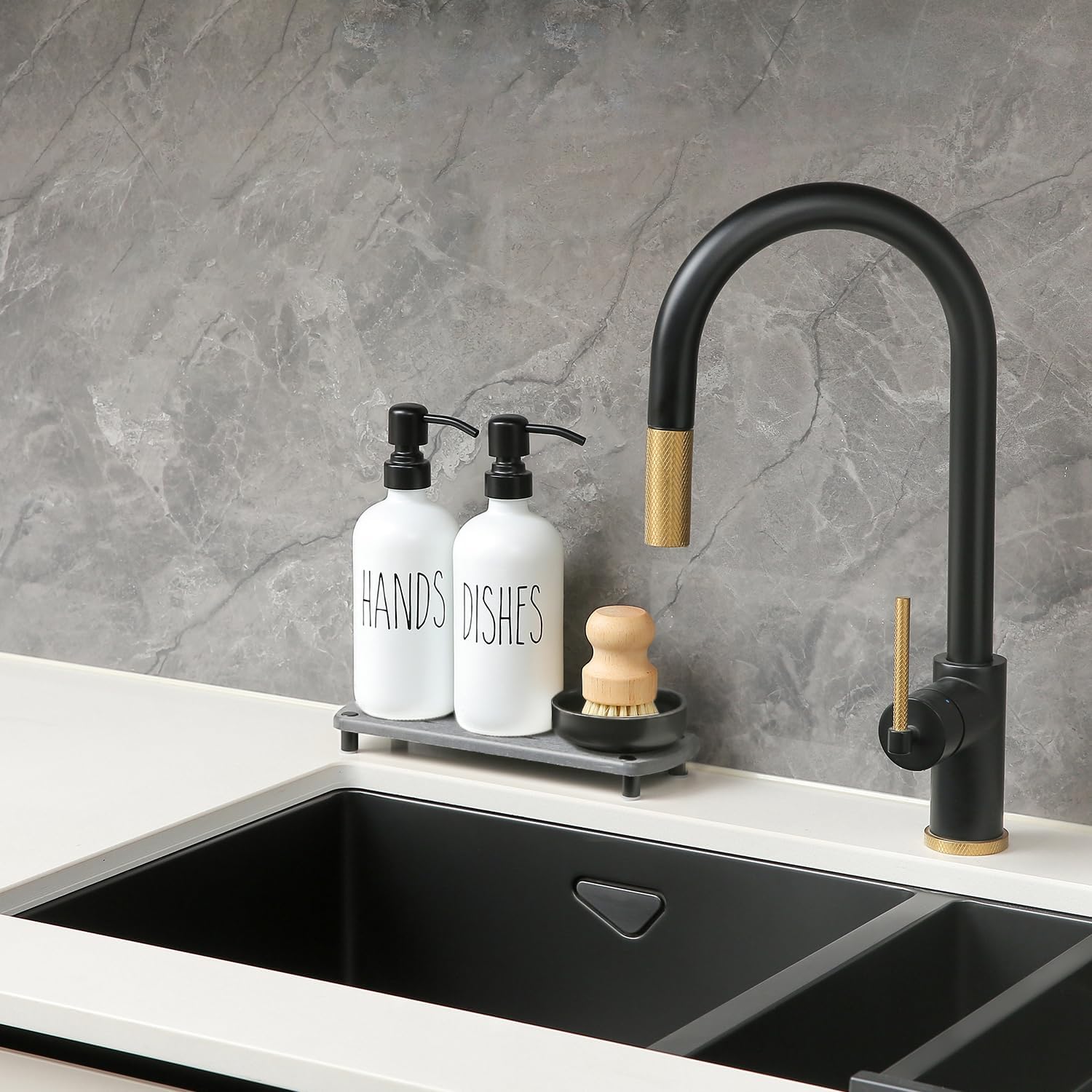 - [Aesthetic Appeal] Elevate the aesthetic of your kitchen with the kitchen hand soap dispenser set. The minimalist design of the soap pump dispenser adds a stylish flair to any countertop and is also very suitable as kitchen sink accessories.