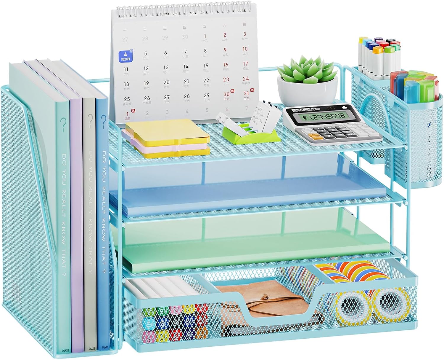 Marbrasse Desk Organizer and Accessories,4-Tier Paper Letter Tray Organizer with File Holder, Desk Accessories & Workspace Organizers with Drawer and 2 Pen Holder (Blue, 15.4" x 9.1" x 8.3")