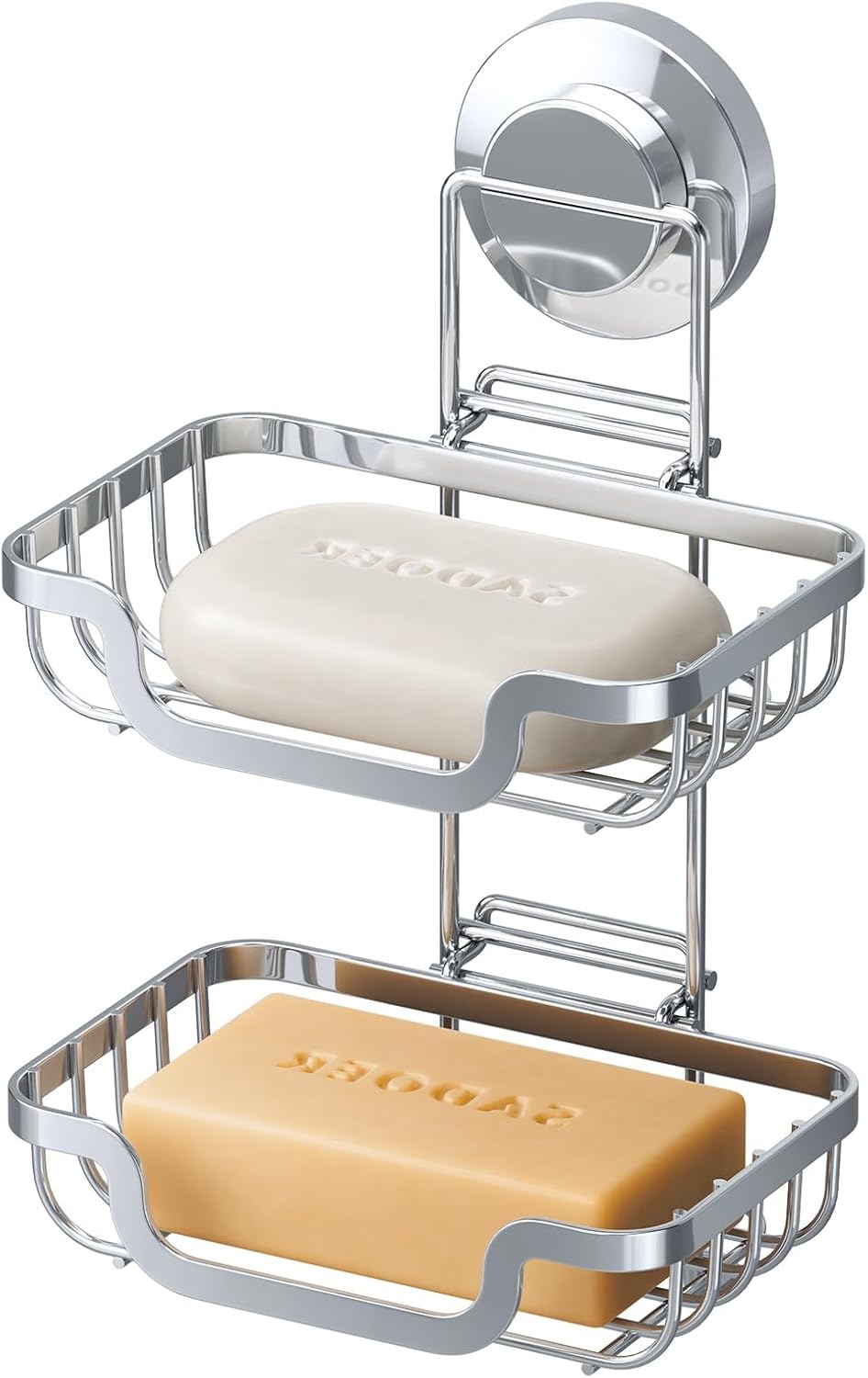 LEVERLOC Bar Soap Holder Dish Suction Cup Wall Mounted, Stainless Steel Double Layer Soap Saver for Shower Bathroom Bath Tub Kitchen Sink, Removable Waterproof, Keep Dry, Silver