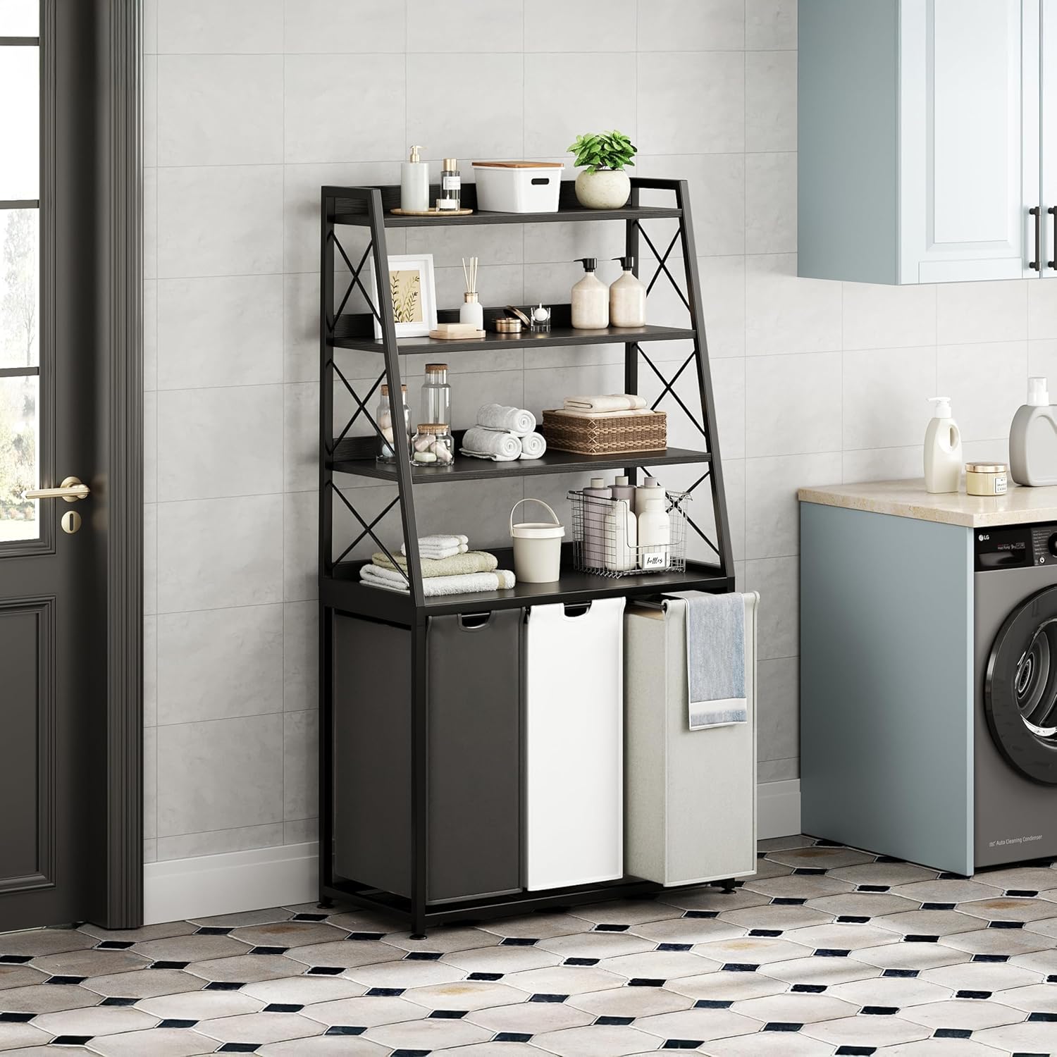 Laundry Basket, 3 Section Laundry Hamper with 4 Tiers Shelf, Pull-Out and Removable Laundry Bags, Large 3 x 15.87 Gallons, for Laundry Room Bathroom Black PF05XLK