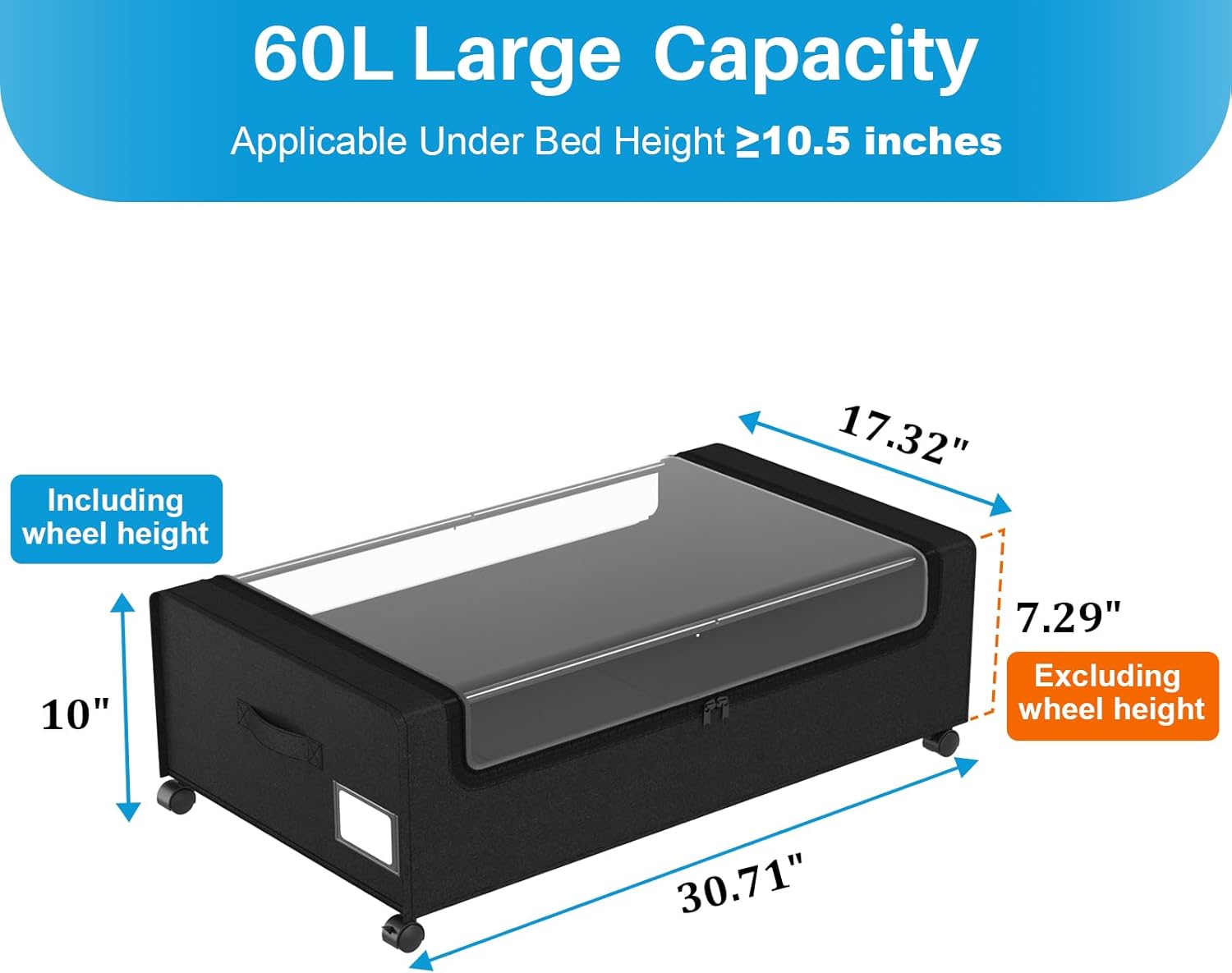 - No Clutter, Space Saver: Our large under bed storage containers measures 30.7"L x 17.3"W x 10"H (wheel-included) fits perfectly under most beds with 10.5" clearance or more. Ideal for apartments and small homes, this large-capacity storage solution helps eliminate clutter in bedrooms, dorms, and closets. Label slots let you categorize contents Use it in closets, nurseries, or even as a shoe organizer under bed—because chaos doesn’t stand a chance!