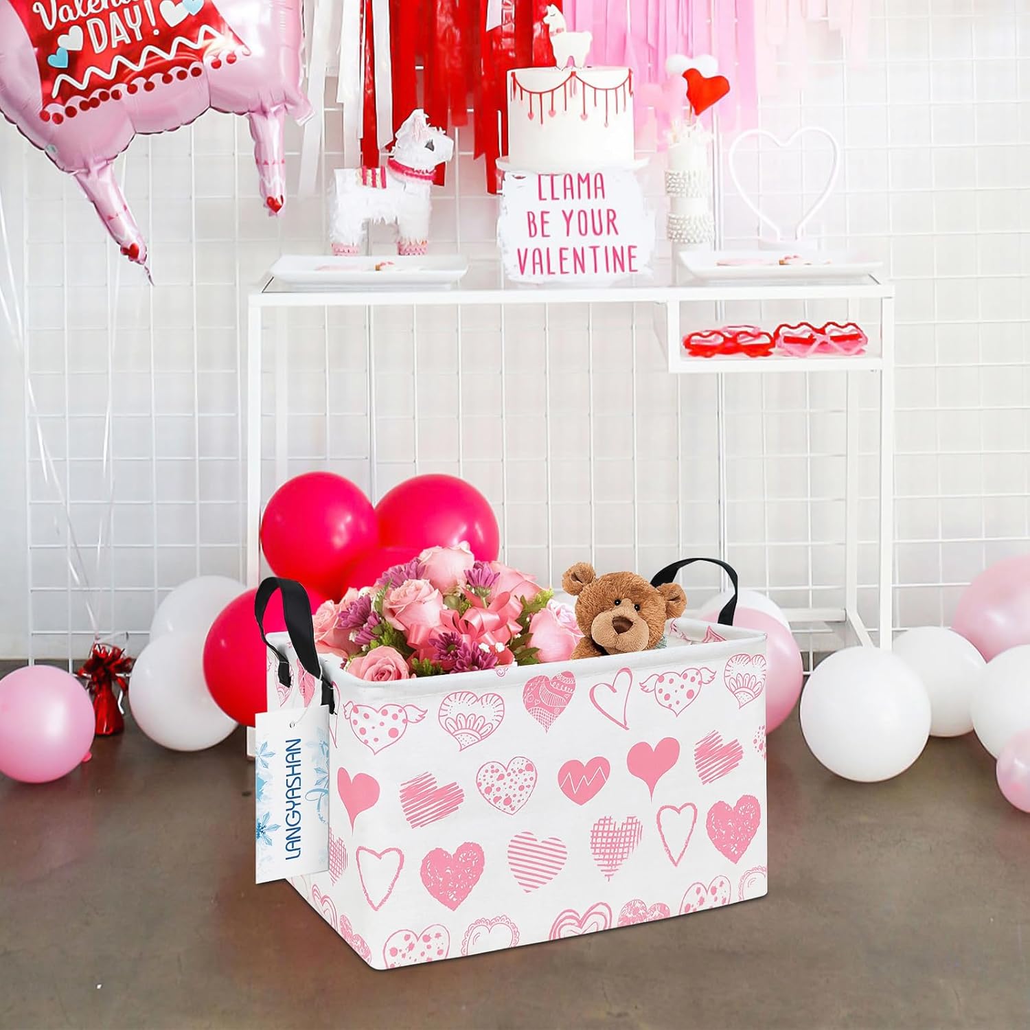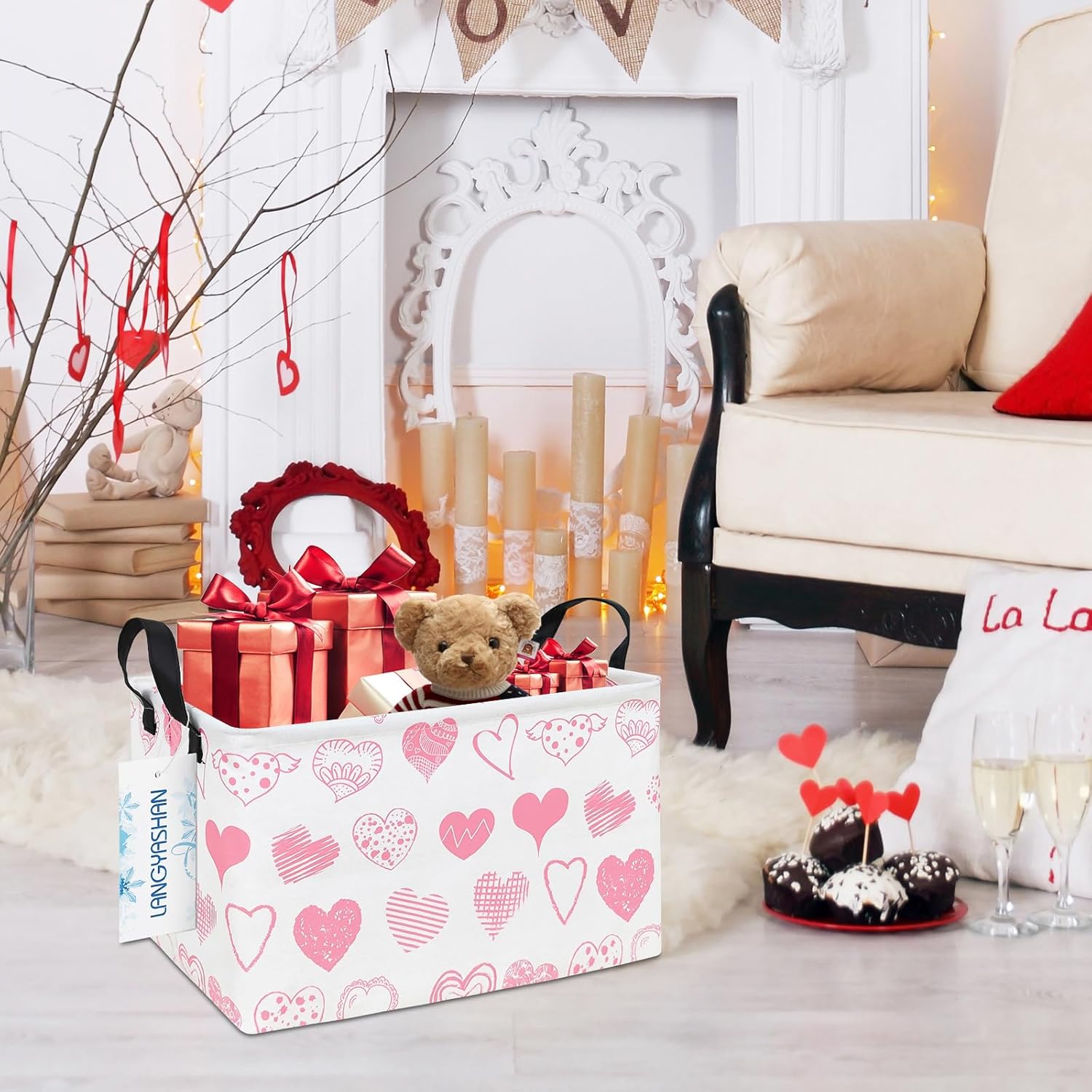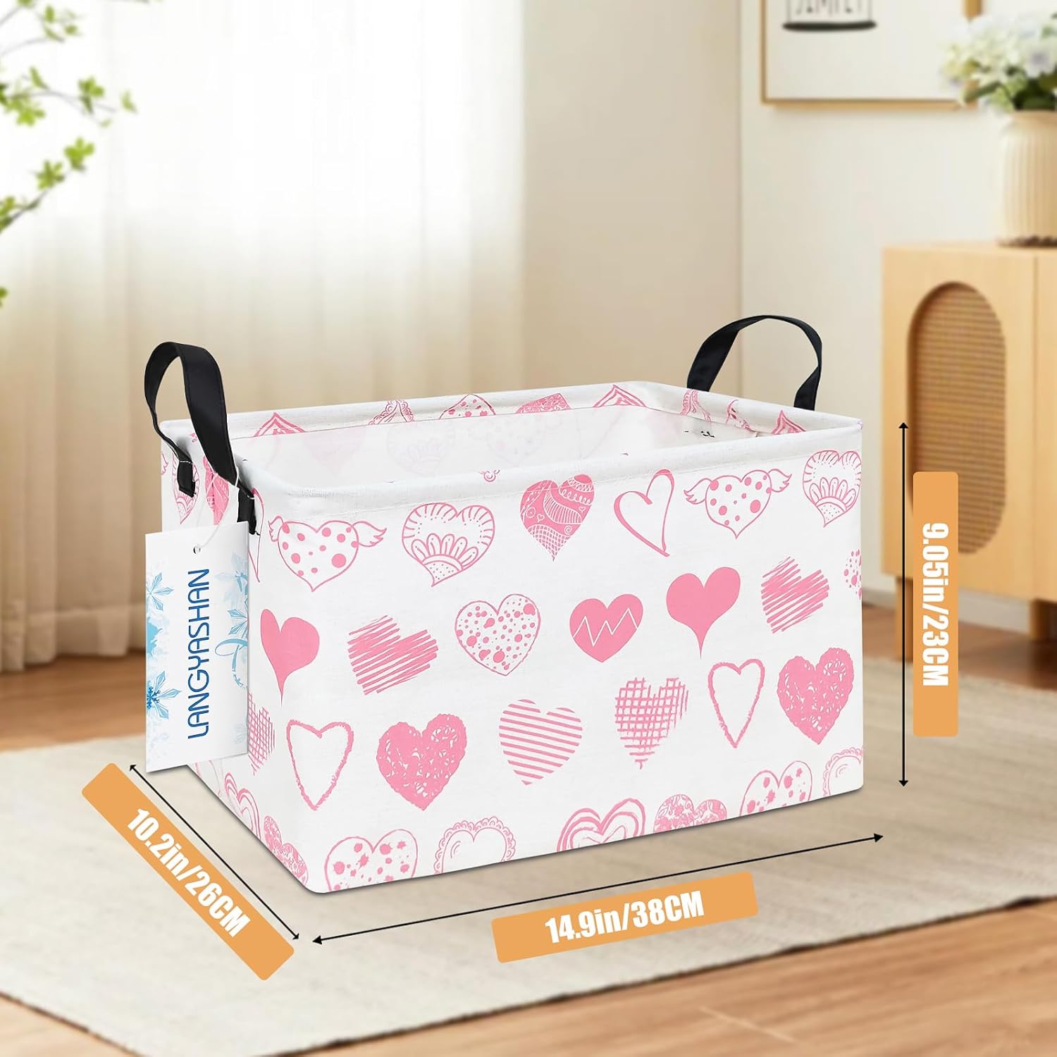 LANGYASHAN Rectangular Storage Bin Collapse Canvas Fabric Cartoon Storage Basket with Handles for Organizing Home Kitchen Boys and Girls Toys Office Closet Shelf Baskets (Rec Angel Heart)