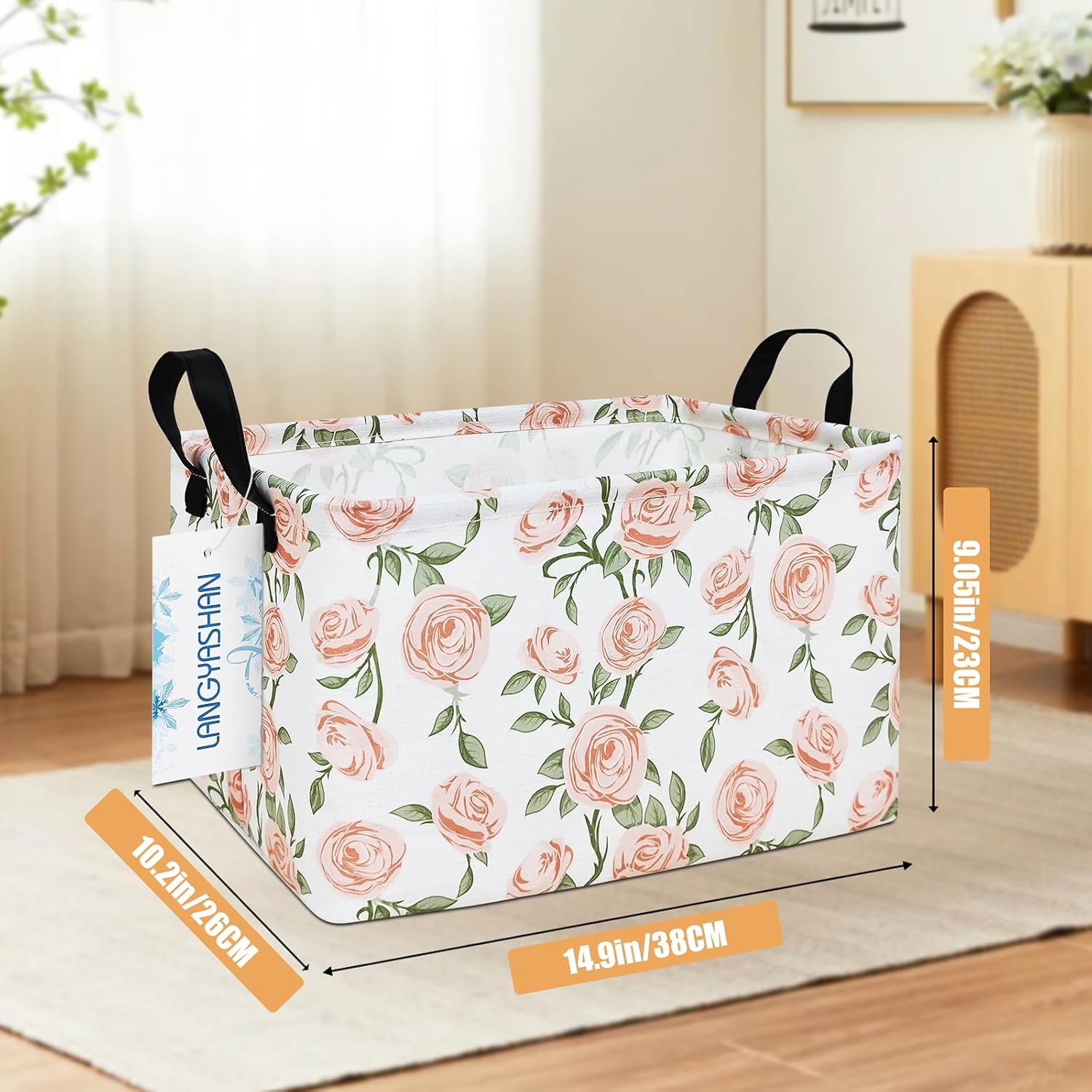 LANGYASHAN Rectangular Storage Bin Collapse Canvas Fabric Cartoon Storage Basket with Handles for Organizing Home Kitchen Boys and Girls Toys Office Closet Shelf Baskets (Rec Champagne Rose)
