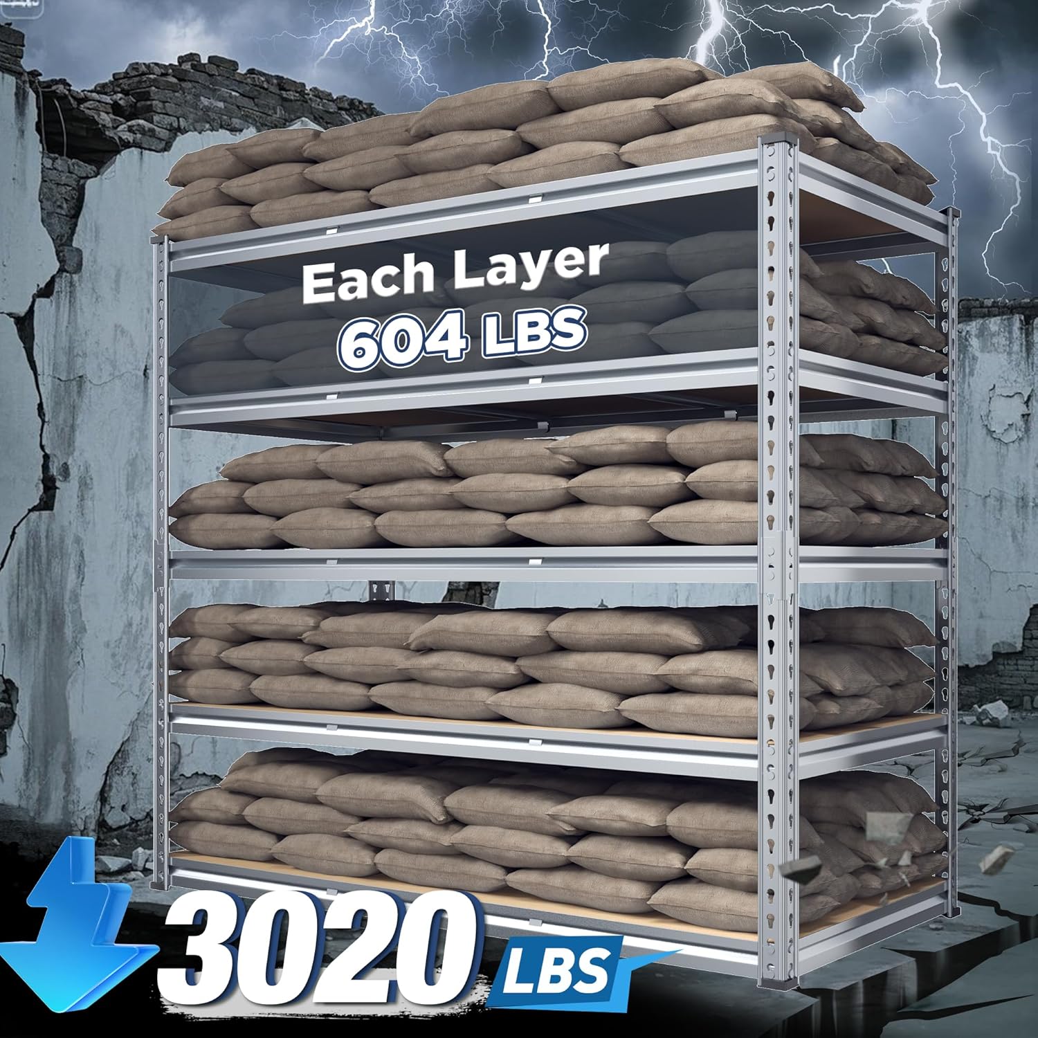 - 【Garage Shelving Heavy Duty - 3020LBS Capacity】REIBII garage shelves are built like a tank! Thick steel legs and chunky boards can carry 604lbs on each shelf – that's 3020lbs total! Suit for stacking toolboxes, car parts, or even your camping gear. No wobbling, no bending, just rock-solid storage