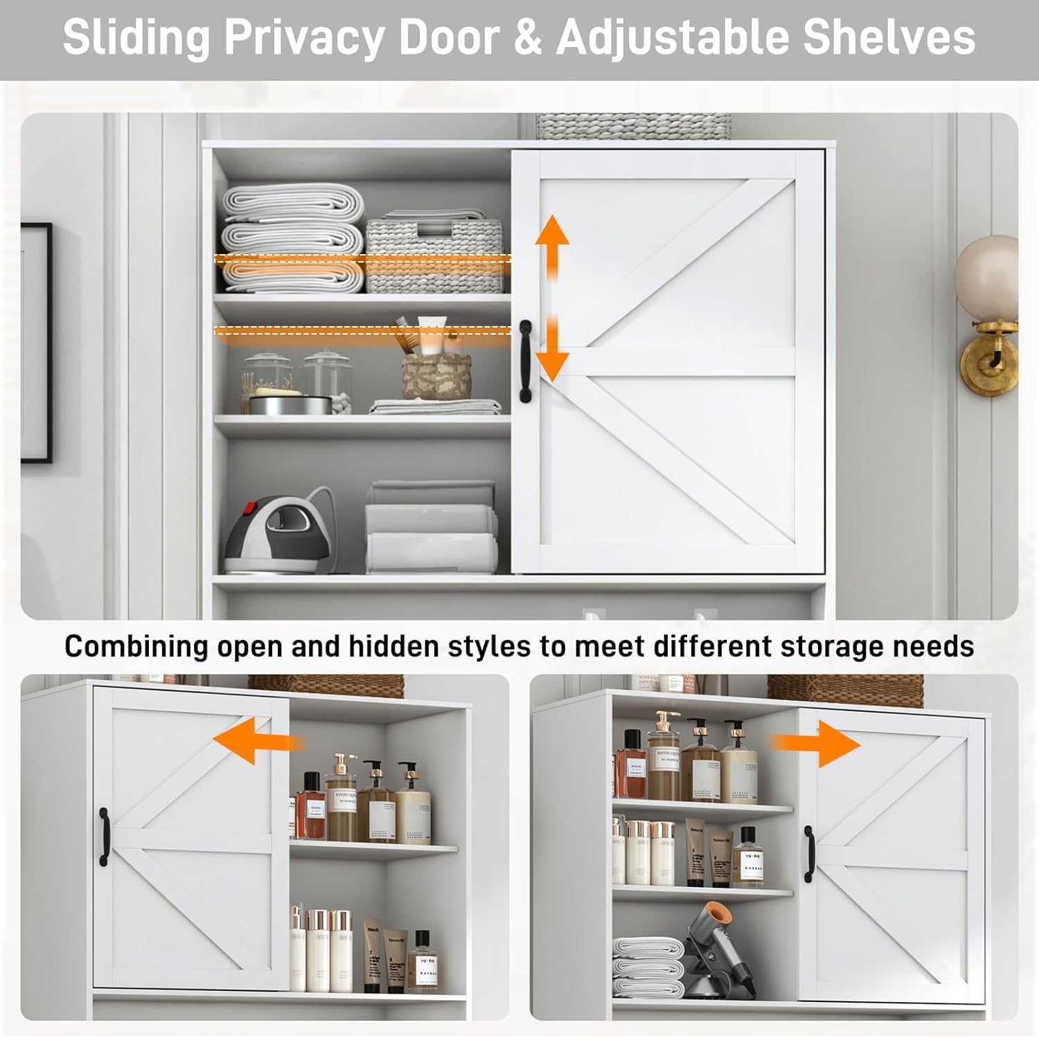 - Multifunctional open design: This barn-style laundry room cabinets is equipped with a removable sliding door and a spacious open countertop. You can place Common laundry supplies such as Laundry detergent, cleaning agent, Resoftener, etc. on the countertop for easy use. The adjustable partition design is clever, which does not take up space and provides great convenience. It is suitable for any laundry room environment that needs to save space and pay attention to aesthetics