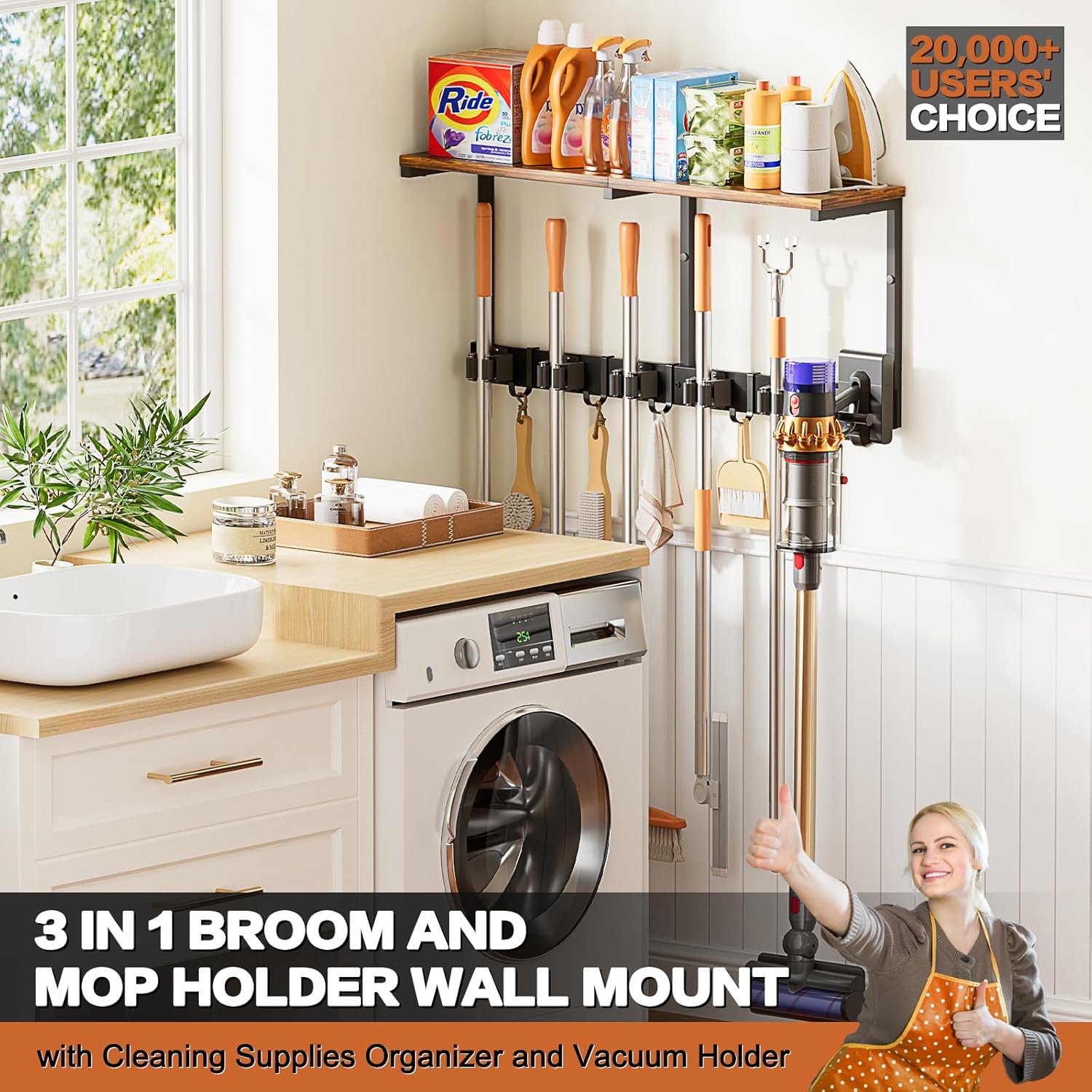 - 【3 in 1 Broom Holder Wall Mount】The all-in-one wall broom hanger combines broom rack, vacuum holder, and utility shelf into one sleek, space-saving design. The broom and mop organizer wall hanging keeps your cleaning tools organized, off the floor, and always within easy reach—turning everyday chaos into tidy efficiency.