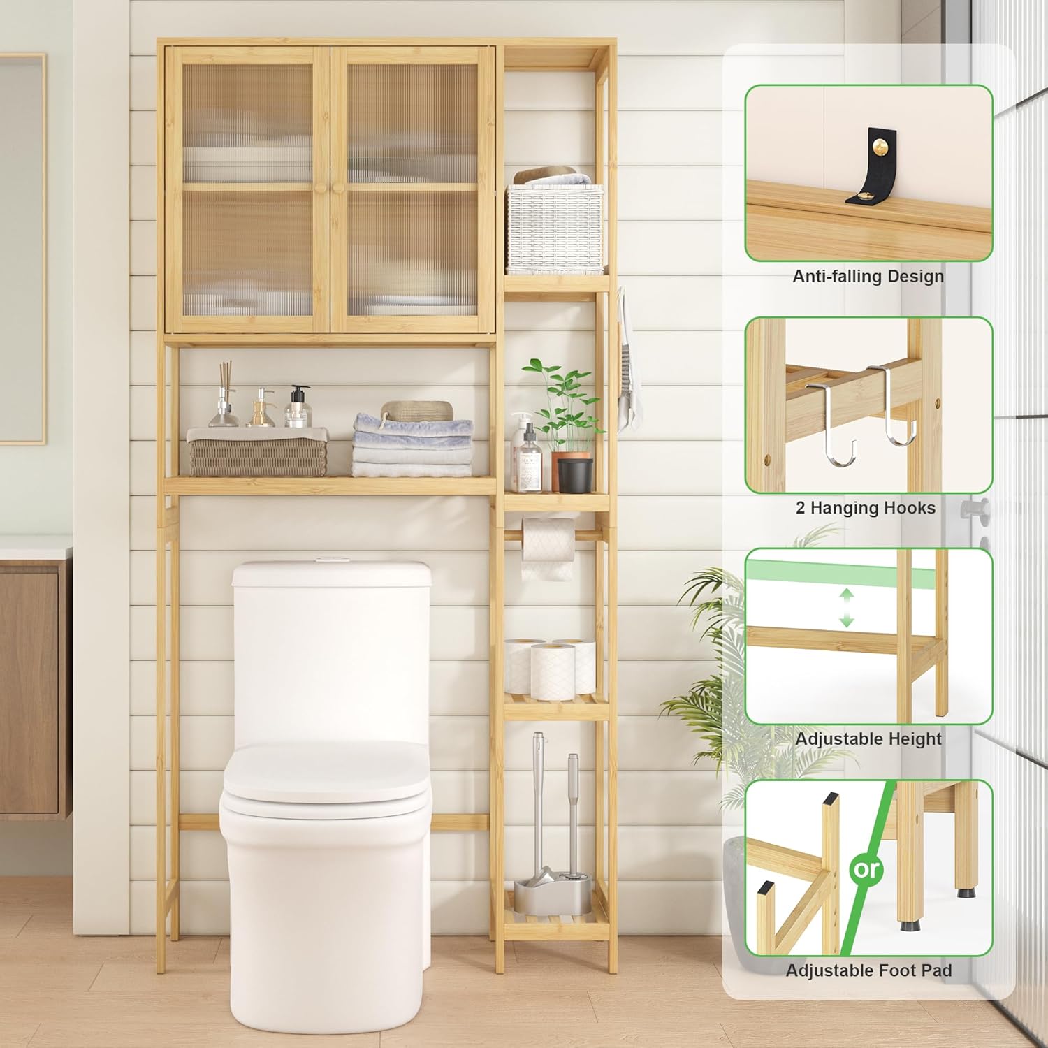 Over The Toilet Storage Cabinet Above Toilet Bathroom Organizer with Toilet Paper Holder Stand Bath Organizer with Adjustable Shelves & Acrylic Doors,Anti-Tip Device (Nature)